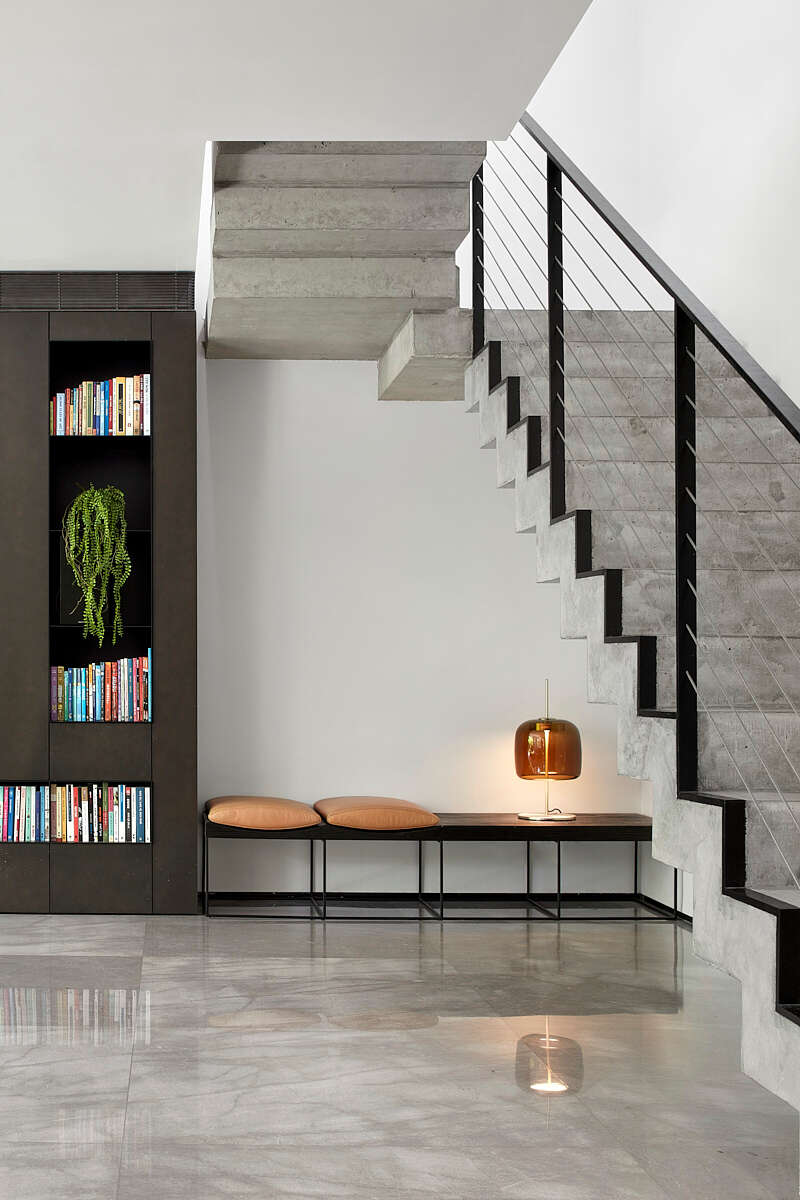 גוף תאורה קטן אך משמעותי, מתחת לגרם המדרגות. תכנון ועיצוב: שלומית זלדמן / צילום: שי גיל