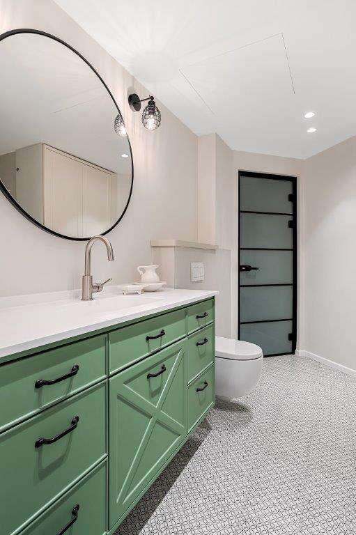 חדר הרחצה לאחר השיפוץ – ארון אמבט ירקרק מכניס עניין ורעננות לחלל / צילום: מאור מויאל