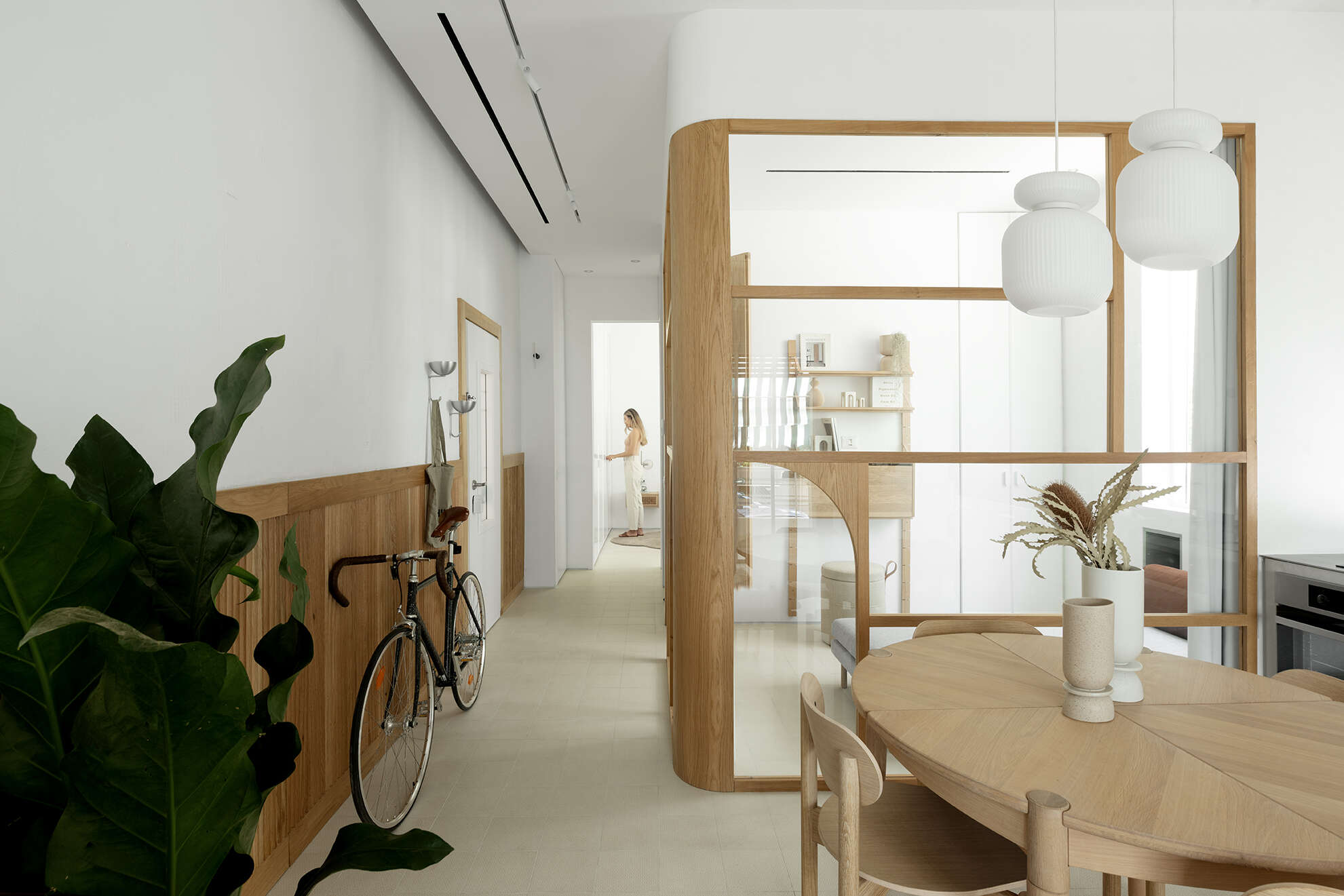 חיפוי עץ על קיר המבואה, prat living - prat space, עיצוב פנים: דורי רדליך/ צילום: גדעון לוין