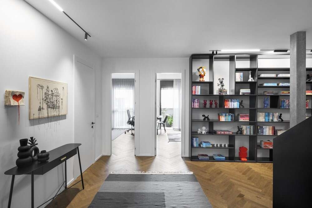 מבואת הכניסה צופה אל הספרייה, משמאל שידת קומודה דקורטיבית / תכנון: עדי אדליס / צילום: טל ניסים