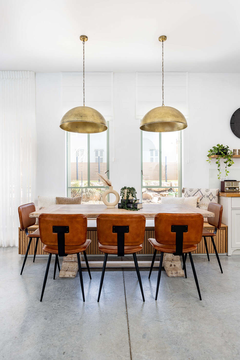 פינת האוכל מעוצבת בסגנון כפרי כשבצד אחד מוקמו כיסאות מרופדים, ומהצד השני ספסל עץ מחורץ.