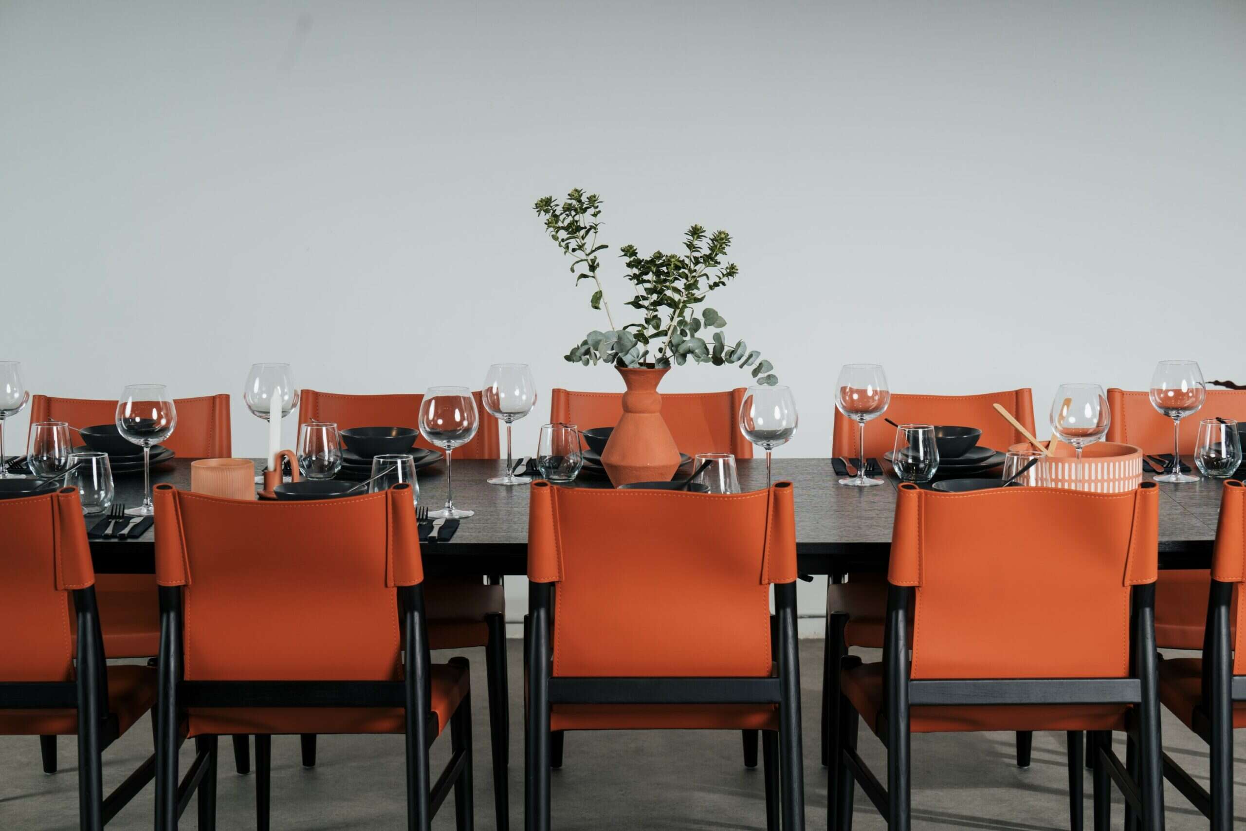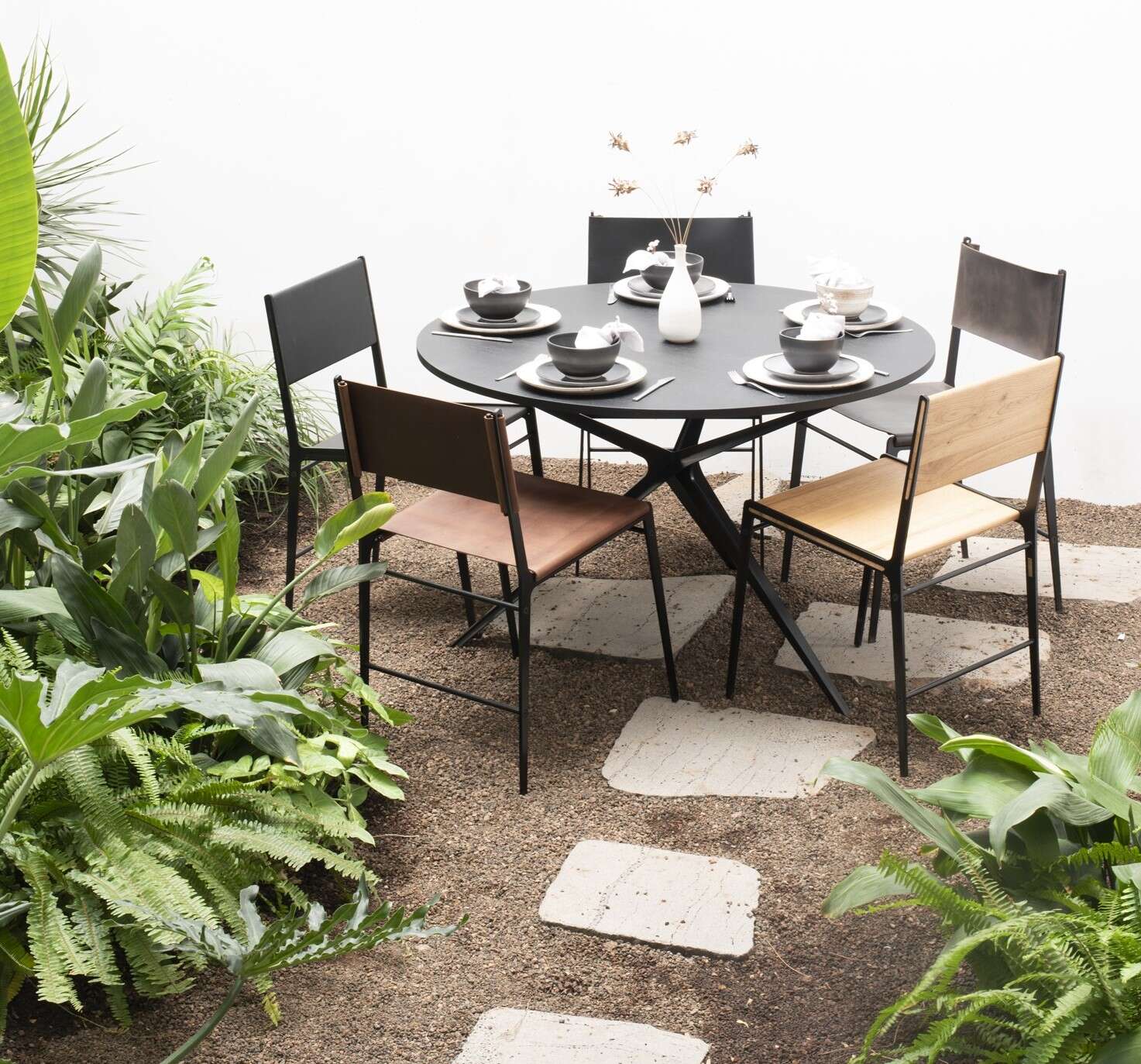 שולחן מתכת עם ארבעה כיסאות עור בגוונים שונים, סטודיו NACHSHON, טקסטיל מאירה סיטון, קרמיקה Studio Now / צילום: סטודיו NACHSHON