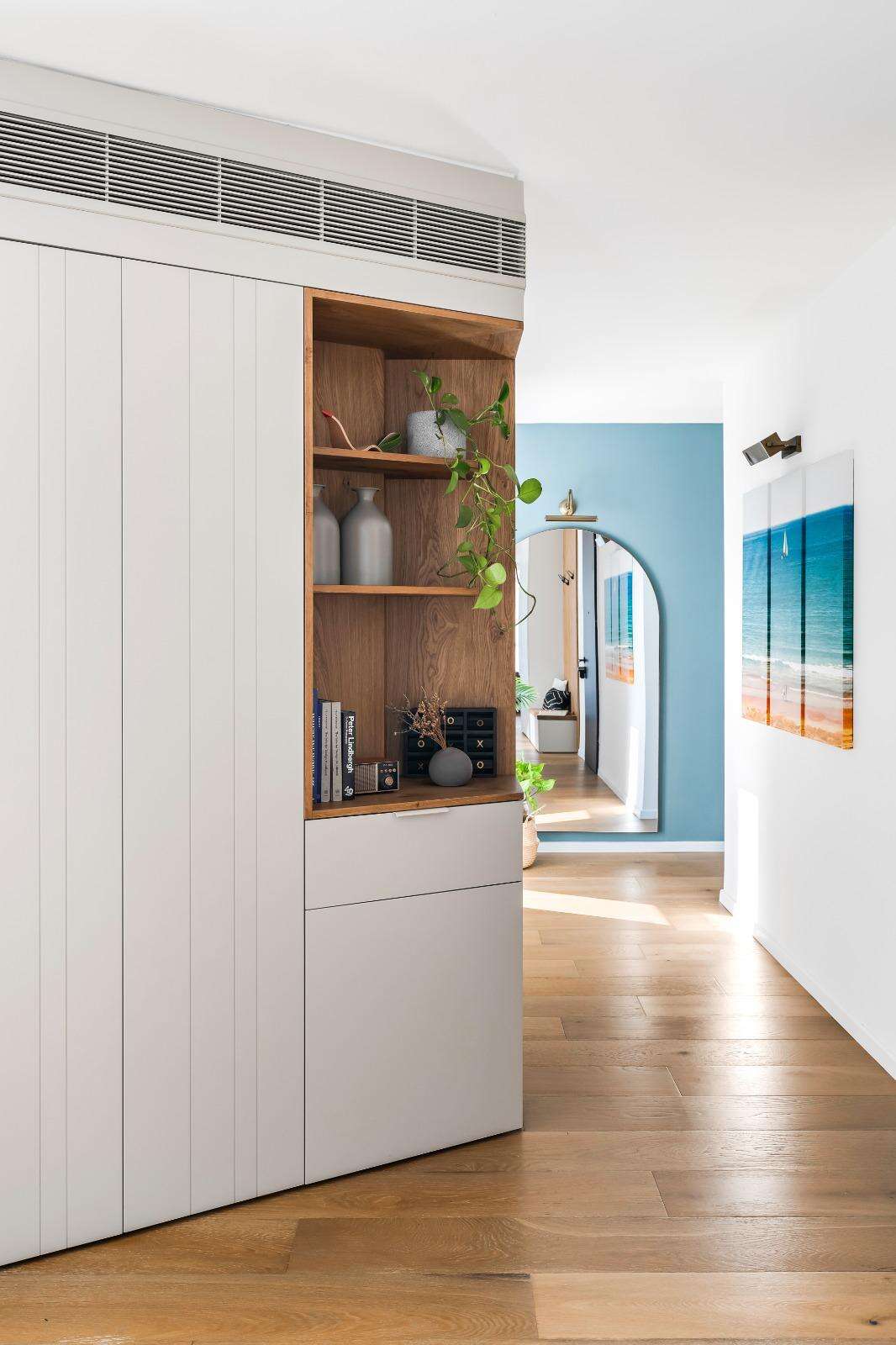 הקיר בכניסה לדירה שמוביל לשירותי האורחים חופה בנגרות בהירה ומשופעת בתאי אחסון ומדפים לתצוגת אקססוריז, מה שגורם לטשטוש והופך את האזור כולו מזוויתי לישר ומהוקצע. יחידת נגרות משמעותית נוספת שממוקמת באזור הכניסה היא זו שממשיכה ועוטפת את קיר הסלון ומגדירה את אזור המולטימדיה.
