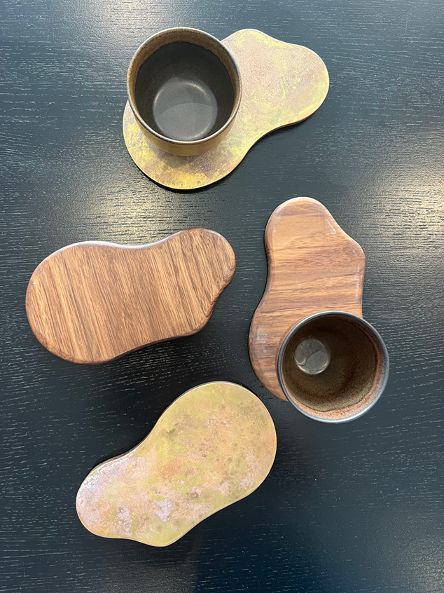 תחתיות מעוצבות בצורות אמורפיות המשלבות עץ ופליז. מחיר: 140 שקלים (יש 15% הנחת חג), סטודיו NACHSHON ו- כוסות קרמיקה של ODAKA 120-180 שקלים לכוס