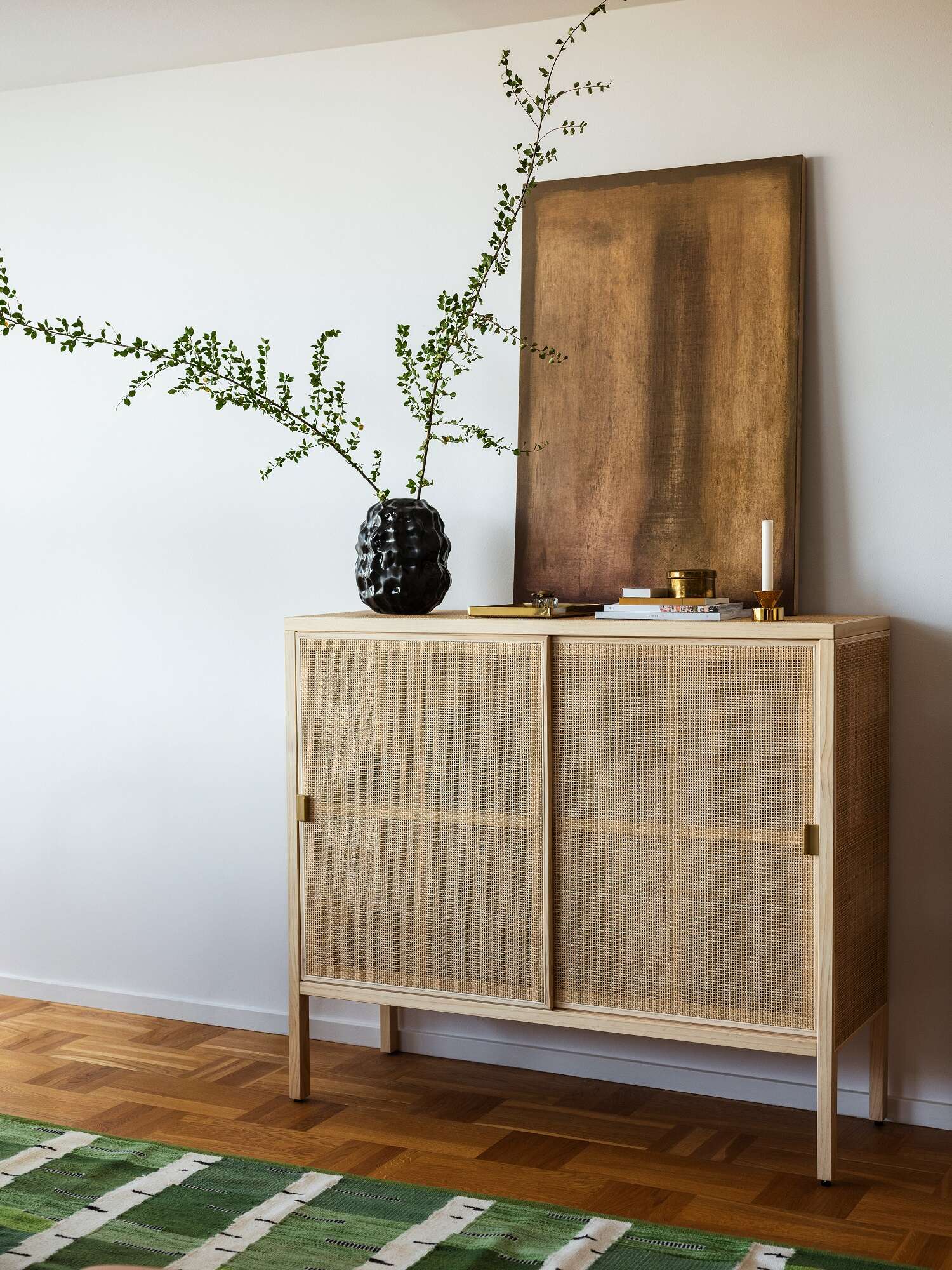 ארון הראטן האייקוני עם דלתות ההזזה מציג משטח שנקלע מסיבי ראטן בעבודת יד. הראטן מככב גם במשענת הגב של אחד מכיסאות האוכל, ובכורסה המתהדרת במסגרת ראטן עמידה עם כרית עמוקה.