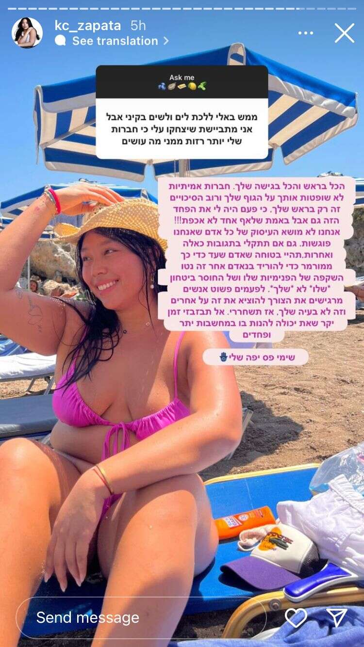 "ממש בא לי ללכת לים ולשים ביקיני, אבל אני מתביישת שיצחקו עליי כי חברות שלי יותר רזות ממני. מה עושים?", שאלה אחת הגולשות את קייסי, שבחרה להשיב על רקע תמונה של בביקיני ורוד. "הכל בראש והכל בגישה שלך", פסקה זפטה. "חברות אמתיות לא שופטות אותך על הגוף שלך. פעם היה לי את הפחד הזה, אבל שלאף אחד לא אכפת!", קבעה.
