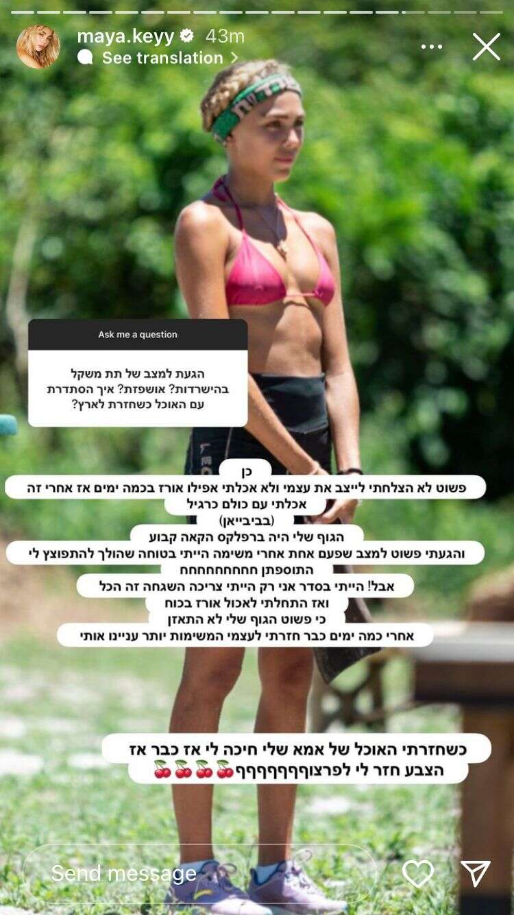 גם הדוגמנית מאיה קיי התייחסה כאמור לשאלה שעסקה סביב נושא המשקל. "הגעת למצב של תת משקל ב'הישרדות'? אושפזת? איך הסתדרת עם האוכל כשחזרת לארץ?", שאלו על פרטים אישיים. "כן, פשוט לא הצלחתי לייצב את עצמי ולא אכלתי אפילו אורז. הגוף שלי היה ברפלקס הקאה קבוע", תיארה את המצב הקשה. "הגעתי פשוט למצב שפעם אחת אחרי משימה, הייתי בטוחה שהולך להתפוצץ לי התוספתן, אבל הייתי בסדר. רק הייתי צריכה השגחה, זה הכל", שחזרה. "התחלתי לאכול אורז בכוח, כי פשוט הגוף שלי לא התאזן. אחרי כמה ימים כבר חזרתי לעצמי", הוסיפה. "כשחזרתי (מהאי) האוכל של אימא שלי חיכה לי, אז כבר הצבע חזר לי לפרצוף", סיכמה.