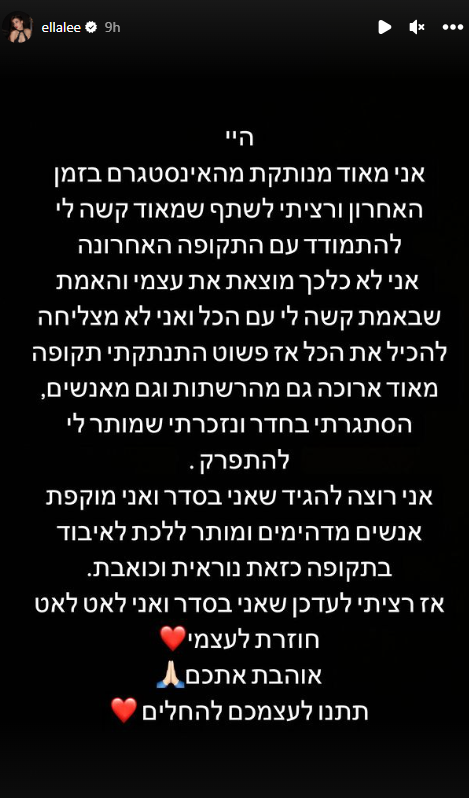 "אני מאוד מנותקת מהאינסטגרם בזמן האחרון ורציתי לשתף שמאוד קשה לי להתמודד עם התקופה האחרונה", כתבה. "אני לא כל כך מוצאת את עצמי והאמת שבאמת קשה לי עם הכל ואני לא מצליחה להכיל את הכל אז פשוט התנתקתי תקופה מאוד ארוכה גם מהרשתות וגם מאנשים, הסתגרתי בחדר ונזכרתי שמותר לי להתפרק.