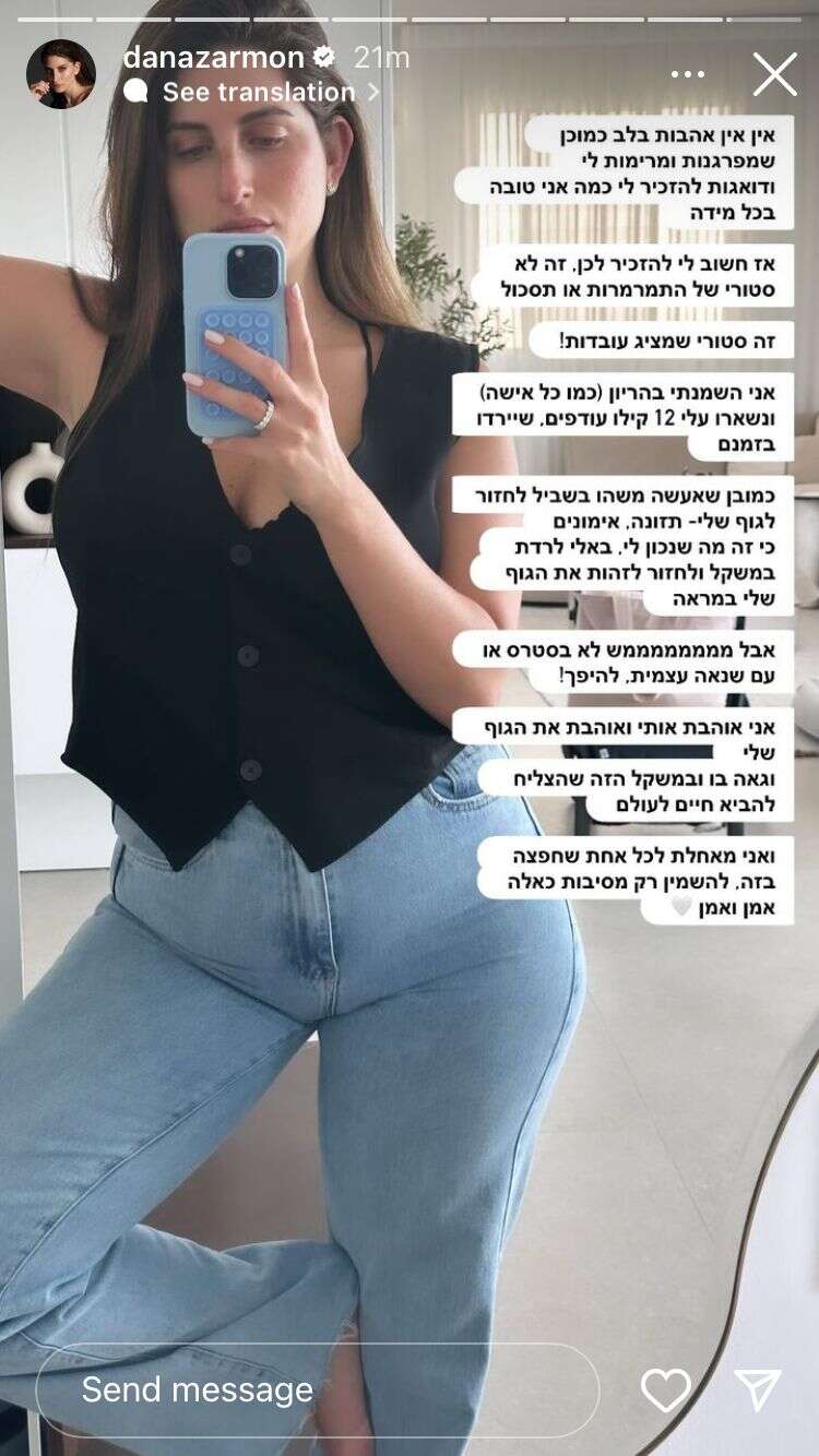 כחודש לאחר שילדה את בתה השנייה, אושיית הרשת דנה זרמון הציגה אמש (שבת) את גזרתה העדכנית לעיני כל 606 אלף עוקביה באינסטגרם – וסיפרה על הרצון שלה להוריד ממשקלה.