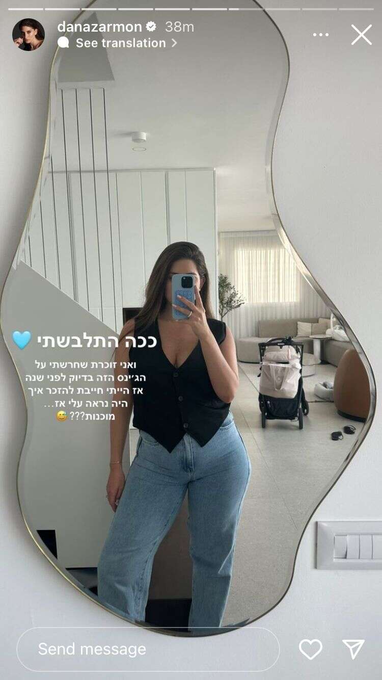 "ככה התלבשתי", כתבה זרמון על רקע תמונת סלפי במכנסי ג'ינס אותם נהגה ללבוש לפני ההיריון, שהמחישה לה את ההבדל בגדול בין נתוניה לפני ואחרי הלידה, בסטורי אחד שפרסמה מתוך סדרת סטוריז שפרסמה בנושא דימוי גוף. "אני זוכרת שחרשתי על הג'ינס בדיוק לפני שנה, אז הייתי חייבת להיזכר איך הם היו נראים עליי".