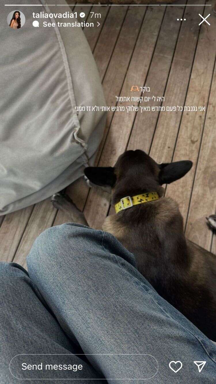"בוקר", בירכה תחילה עובדיה את עוקביה. "היה לי יום קשוח אתמול. אני נגנבת כל פעם מחדש שלוקי (הכלב הנוסף של עובדיה; י"ד) מרגיש אותי ולא זז ממני", כתבה על רקע תיעוד של הסיטואציה. מיד לאחר מכן העלתה עובדיה סטורי מההמתנה לטיפול הרפואי שלו נזקקה הכלבה מילקי. "היא לא הרגישה טוב אתמול והיינו צריכים לחזור לטיפול נמרץ", עדכנה. "כל פעם שאני שם זה גומר אותי. אין, כלבים זו אהבה שאי אפשר להסביר!".