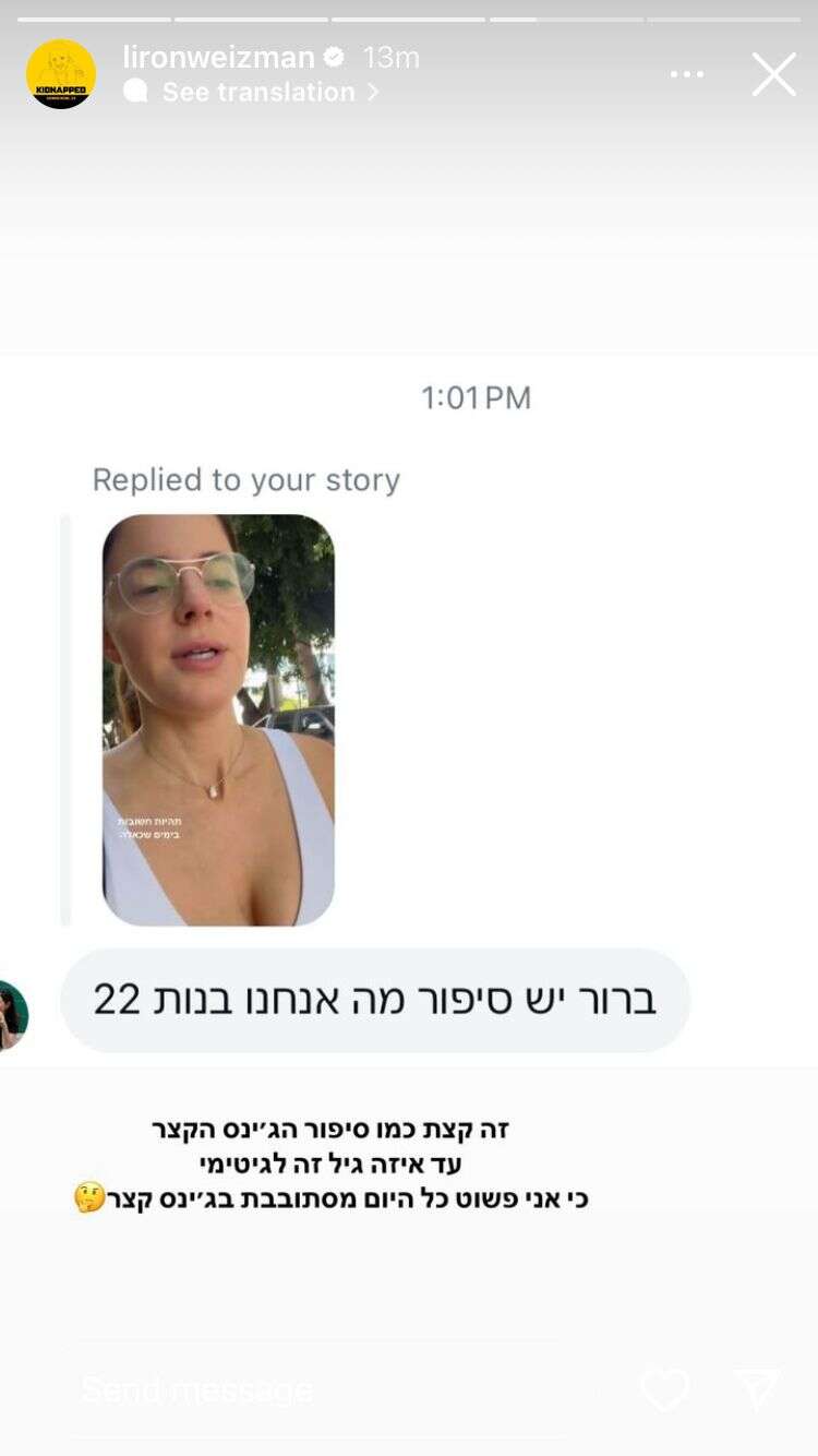ויצמן לא הסתפקה רק בכך, והעלתה תגובה פרטית שקיבלה מצד גולשת שצידדה בה. "ברור, יש סיפור. מה, אנחנו בנות 22?", כתבה אותה גולשת. "זה קצת כמו סיפור הג'ינס הקצר", הוסיפה ויצמן על רקע צילום המסך של ההודעה. "עד איזה גיל זה לגיטימי? כי אני פשוט כל היום מסתובבת בג'ינס קצר".