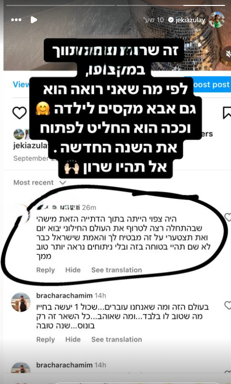 אבל ג'קי לא נשארה חייבת. היא חשפה את זהותו של המגיב: "מדובר במתווך, ואבא מקסים לילדה, וככה הוא החליט לפתוח את השנה החדשה, אל תהיו שרון".