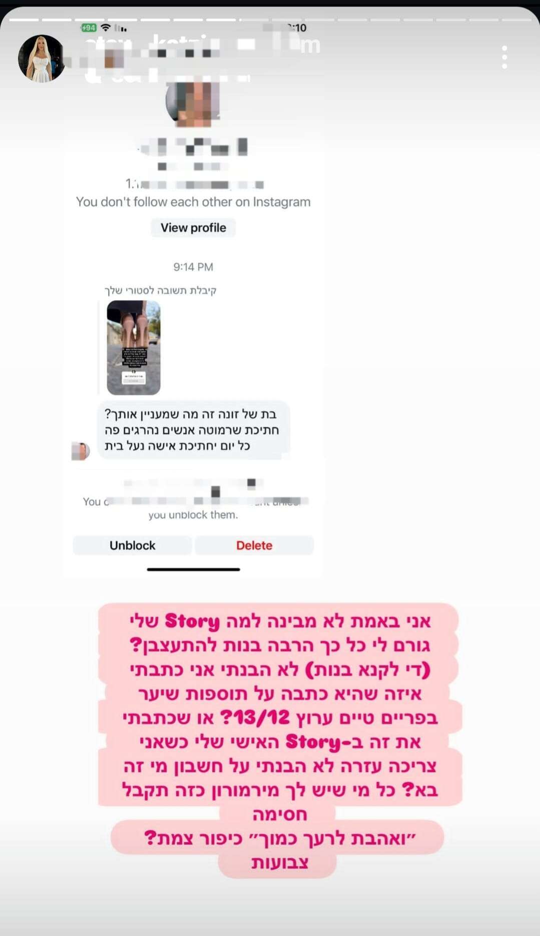 "לא הבנתי. אני כתבתי איזושהי כתבה על תוספות שיער בפריים טיים ערוץ 13/12? או שכתבתי את זה בסטורי האישי שלי כשאני צריכה עזרה. לא הבנתי על חשבון מי זה בא? כל מי שיש לך מירמורון כזה תקבל חסימה, הבהירה ואכן ביצעה. 'ואהבת לרעך כמוך'.כיפור צמת? צבועות".