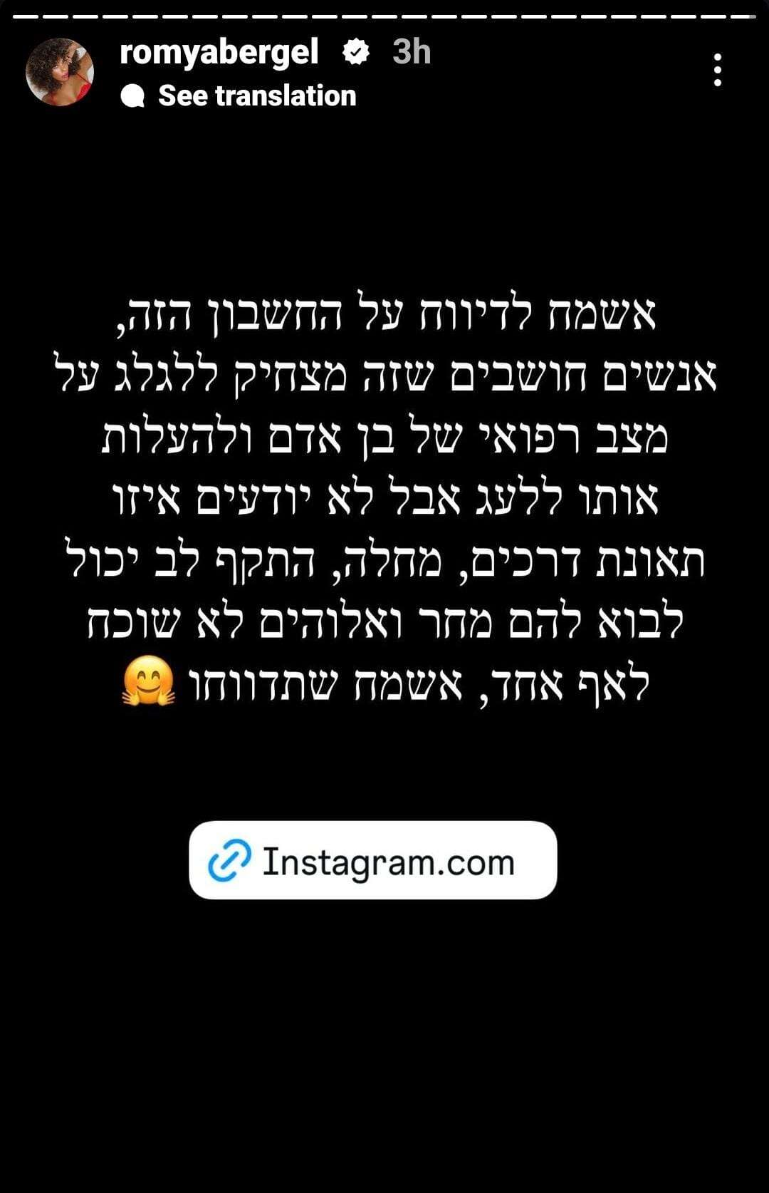 לצד התמיכה שהיא מקבלת, רומי משתפת מדי פעם בסטוריז שהיא מעלה גם בקושי הנפשי שהיא חווה שמגיע מתגובות לעגניות ומחוסר הכלה מצד עוקבים וטרולים, כשאתמול (ראשון) ביקשה גם את עזרת העוקבים בסגירת חשבון אינסטגרם שחשב שיהיה משעשע ללעוג למצבה הרפואי וביקשה לדווח עליו כדי להביא לחסימתו.