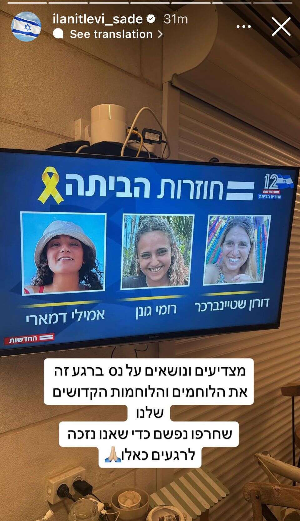 אילנית לוי שיתפה בסטורי באינסטגרם: "אלוהים איזה אושר, דמעות של אושר", ובסטורי נוסף כתבה: מצדיעים ונושאים על הנס ברגע זה את הלוחמים והלוחמות הקדושים שלנו שחרפו נפשם כדי שאנו נזכה לרגעים כאלו".