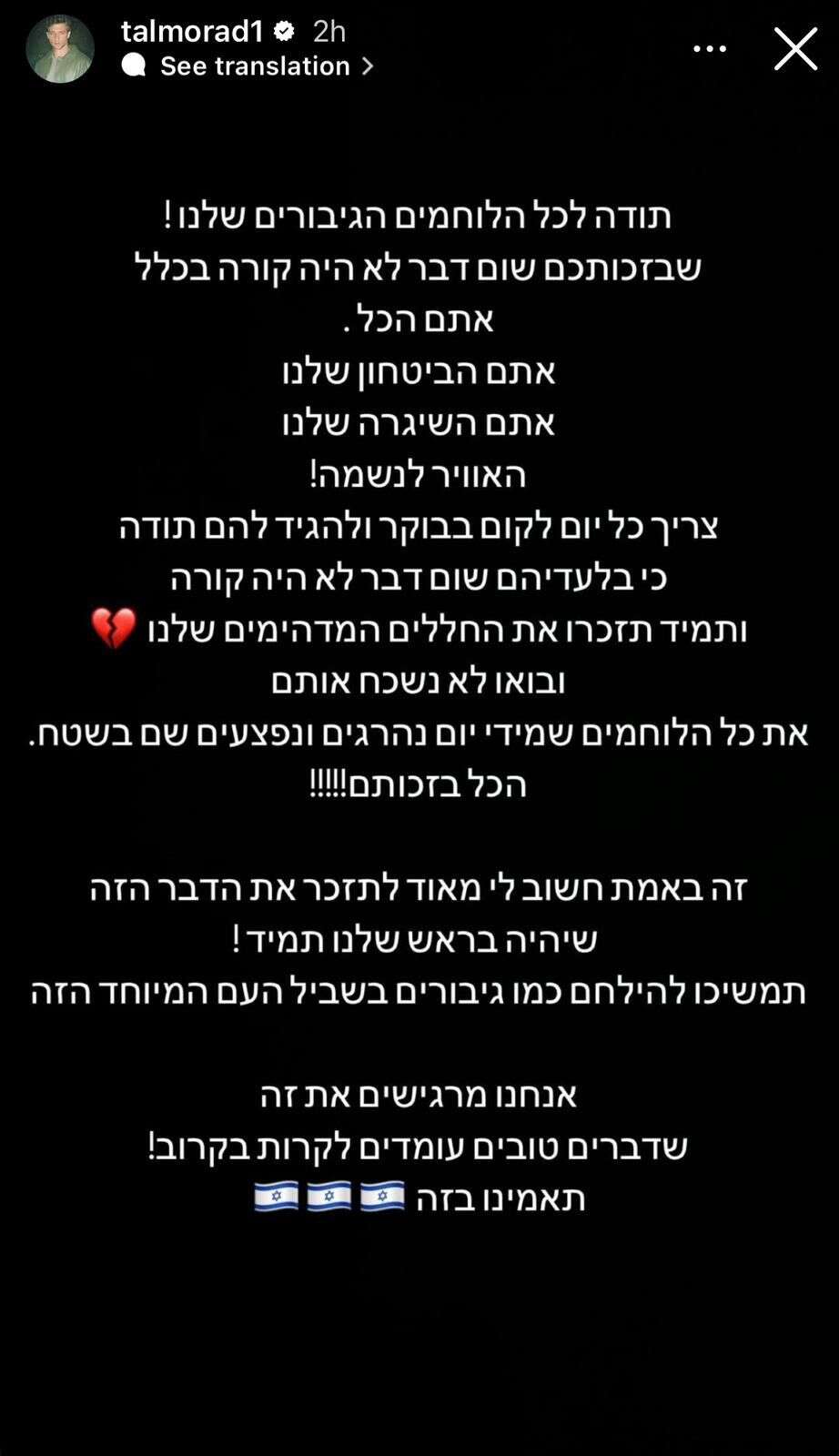 טל מורד הוסיף וכתב בסטורי באינסטגרם: "תודה לכל הלוחמים הגיבורים שלנו! שבזכותכם שום דבר לא היה קורה בכלל, אתם הכל. אתם הביטחון שלנו, אתם השגרה שלנו. האוויר לנשמה. צריך כל יום לקום בבוקר ולהגיד להם תודה. כי בלעדיהם שום דבר לא היה קורה ותמיד תזכרו את החללים המדהימים שלנו, בואו לא נשכח אותם, את כל הלוחמים שמדי יום נהרגים ונפצעים שם בשטח. הכל בזכותם!".