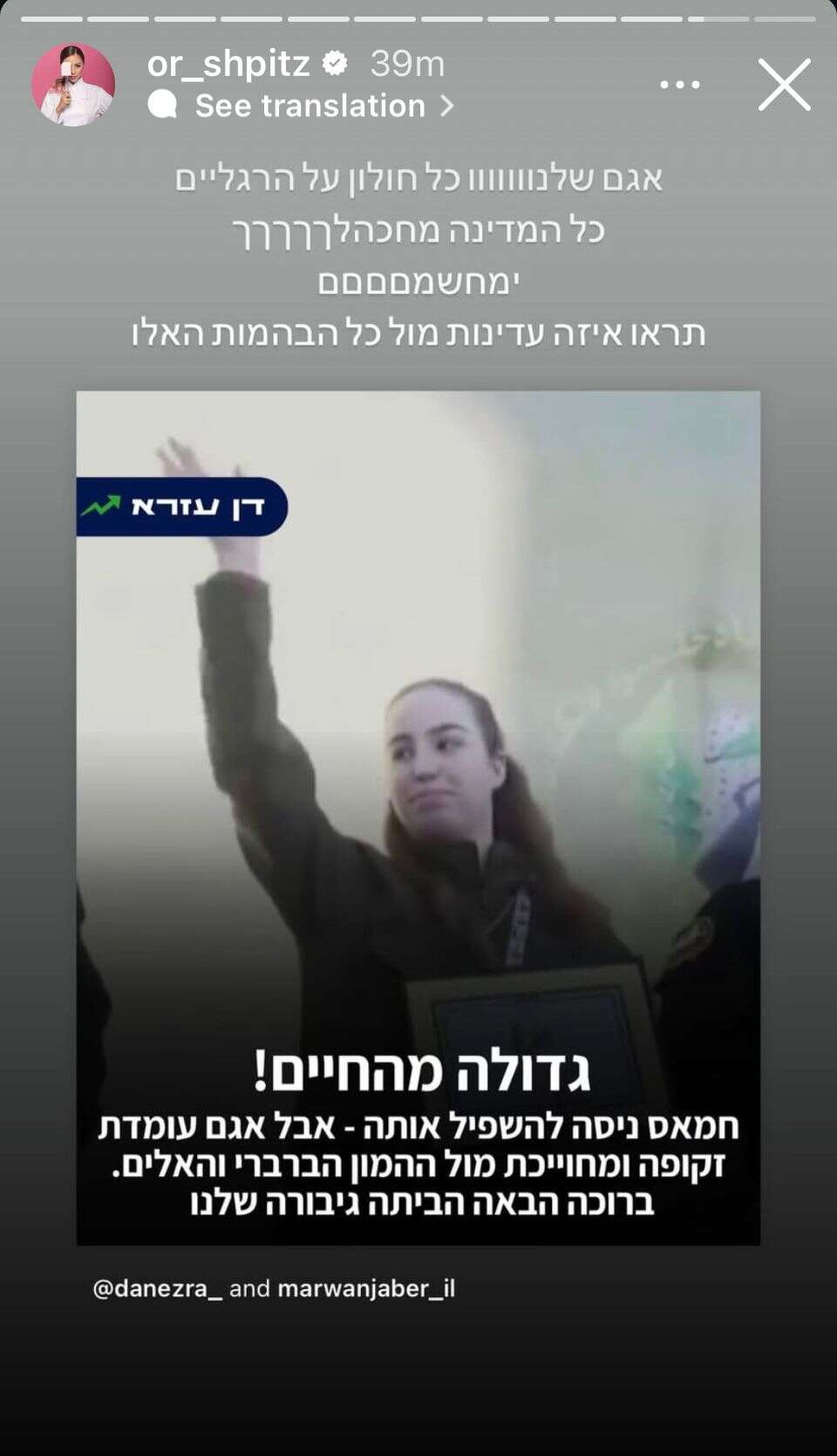 אור שפיץ, הקונדיטורית והמשפיענית תושבת חולון הגיבה: אגם שלנו, כל חולון על הרגליים. כל המדינה מחכה לך. יימח שמם. תראו איזו עדינות מול כל הבהמות האלו".