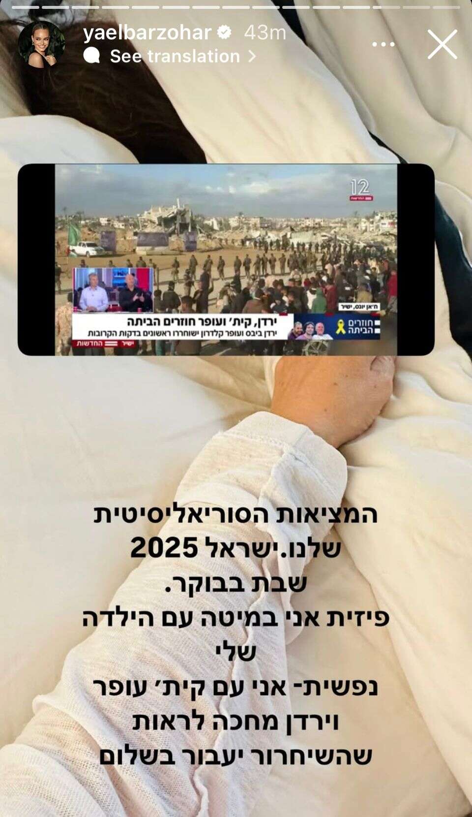 יעל בר זוהר העלתה סטורי באינסטגרם וכתבה: "המציאות הסוריאליסטית שלנו. ישראל 2025, שבת בבוקר. פיזית אני במיטה עם הילדה שלי. נפשית - אני עם קית', עופר וירדן, מחכה לראות שהשחרור יעבור בשלום". בסטוריז נוספים היא כתבה: "תודה לאל. עוד סיוט של משפחה שעברה גיהנום בדרך להסתיים. הלוואי אמן שגם נגלה ששירי והילדים בסדר ושיחזרו גם".