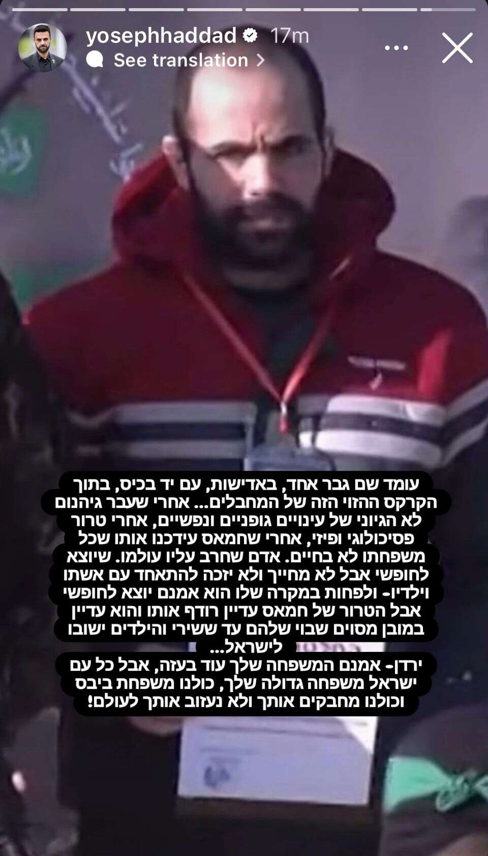 יוסף חדאד כתב בסטורי שהעלה: "עומד שם גבר אחד, באדישות, עם יד בכיס, בתוך הקרקס ההזוי הזה של המחבלים. אחרי שעבר גיהנום לא הגיוני של עינויים גופניים ונפשיים, אחרי טרור פסיכולוגי ופיזי, אחרי שחמאס עידכנו אותו שכל משפחתו לא בחיים. אדם שחרב עליו עולמו. שיוצא לחופשי אבל לא מחייך ולא יזכה להתאחד עם אשתו וילדיו - ולפחות במקרה שלו הוא אמנם יוצא לחופשי אבל הטרור של חמאס עדיין רודף אותו והוא עדיין במובן מסוים שבוי שלהם עד ששירי והילדים ישובו לישראל. ירדן, אמנם המשפחה שלך עוד בעזה, אבל כל עם ישראל משפחה גדולה שלך, כולנו משפחת ביבס וכולנו מחבקים אותך ולא נעזוב אותך לעולם!".