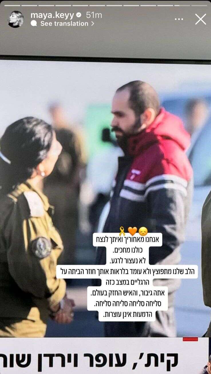 מאיה קיי העלתה סטורי עם תמונה של ירדן ביבס לחשבון האינסטגרם שלה וכתבה: "אנחנו מאחוריך ואיתך לנצח. כולנו מחכים. לא נעצור לרגע. הלב שלנו מתפוצץ ולא עומד בלראות אותך חוזר הביתה על הרגליים במצב כזה, אתה גיבור והאיש הכי חזק בעולם. סליחה, סליחה, סליחה. הדמעות אינן עוצרות". בסטורי אחר זעמה על מחבלי חמאס וכתבה: "בושה לקרוא לכם אנשים כי אין בכם טיפה או קמצוץ של אנושיות. אתם המיץ של הזבל".
