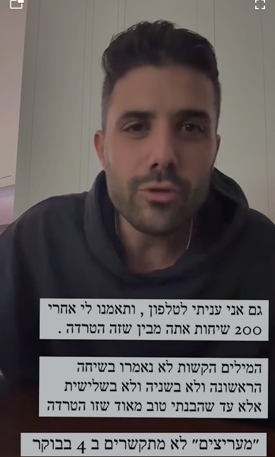"אני גבר. כשאישה קוראת הודעה כזו, רוצחים לה את הנפש. לצחוק על הפלה של תאומים? (הכוונה שלו להפלה שבר חוותה באוגוסט 2023. ע"ח) זה לרצוח את הנפש. מה ההבדל בינך לבין חמאסניק שרוצח גוף ונפשות? זה לרצוח נפש מבפנים. זה פי מאתיים יותר גרוע. אז חברים, האנשים שאתם רואים למעלה ואלה שמתקשרים בפעם השלוש מאות הם מטרידנים. הם לא מעריצים לא משנה באיזה גיל. מעריץ אוהב אותך, מתקשר אליך כמו אחד שאוהב אותך ולא מטרלל אותך, צוחק עליך או מקלל אותך אז תשימו לב לאמת וזו האמת".