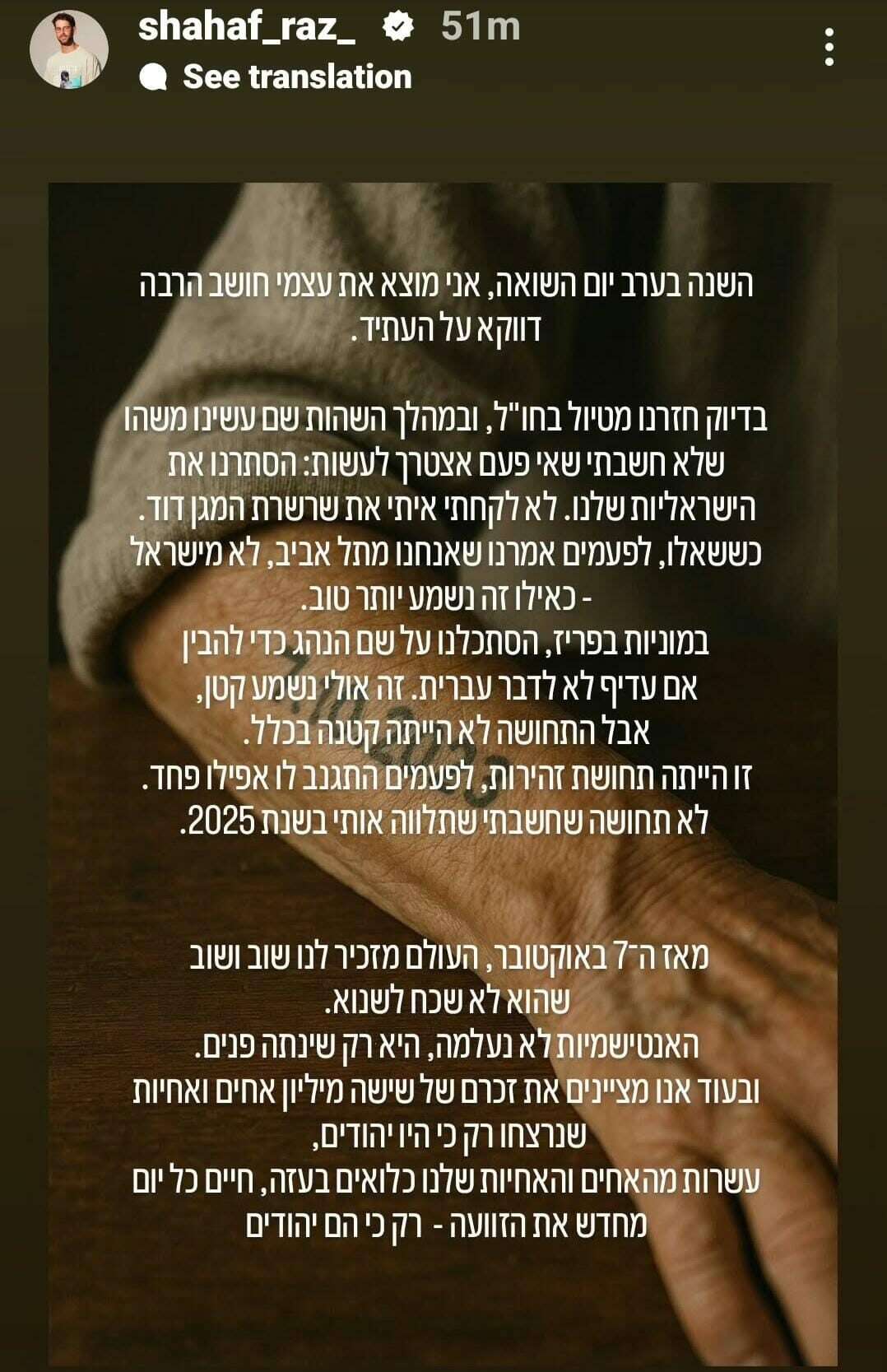"השנה בערב יום השואה אני מוצא את עצמי חושב הרבה דווקא על העתיד", פתח את הסטורי שהגיע לאחר שהוא וטליה שבו מחופשה מפנקת במאוריציוס שם, כך שיתף, חשו בצורך להצניע את היותם ישראלים מחשש שינוכל להם.