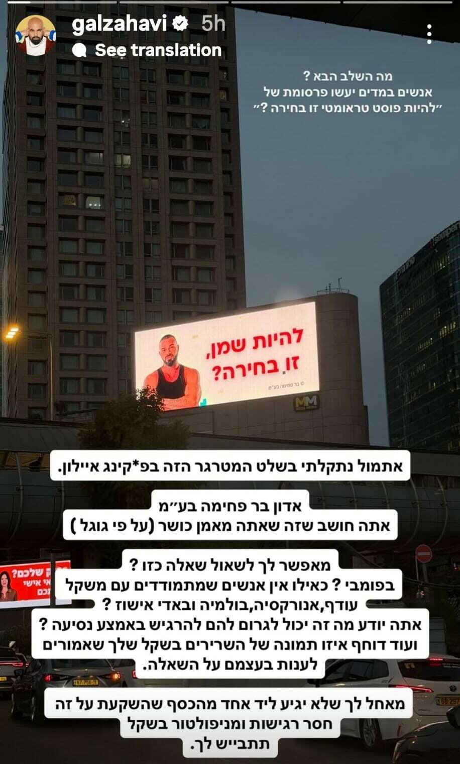 גל, ששיתף לא פעם את מאות אלפי עוקביו בניסיונות שלו לרדת במשקל והנקודה הרגישה שהנושא הזה של משקל ודימוי גוף מהווים בחייו, לא יכל להכיל את זעמו ובחר לשתף אותו היום (חמישי) ברשת עם עוקביו בסדרת סטוריז באינסטגרם שלו: "אתמול נתקלתי בשלט המטרגר הזה בפ*קינג איילון", כתב כשהוא משתף בסטורי את התמונה של הקמפיין בכיכובו של בר. אדון בר פחימה בע"מ", הפנה אצבע מאשימה ישירה כנגדו: "אתה חושב שזה שאתה מאמן כושר (על פי גוגל) מאפשר לך לשאול שאלה כזו בפומבי, כאילו אין אנשים שמתמודדים עם משקל עודף, אנורקסיה, בולמיה ובאדי אישוז?