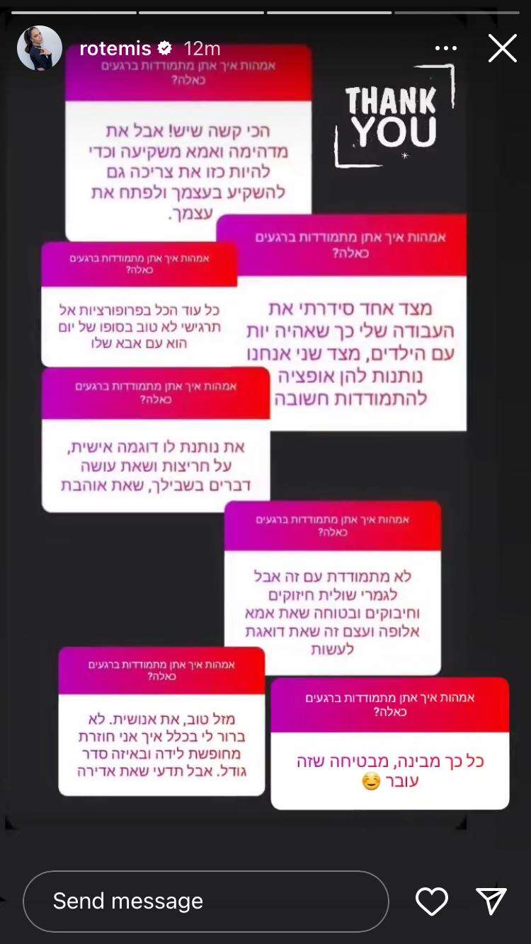 הבוקר, עדכנה ישראל במבול התגובות לדבריה, ושיתפה בחלק מהן. "זה הכי קשה שיש! אבל את אמא מדהימה, וכדי להיות כזו את צריכה גם להשקיע בעצמך ולפתח את עצמך", כתבה אחת הגולשות. "כל כך מבינה. מבטיחה שזה עובר", "זה חשוב להרגיש הכל. את אנושית", עודדו אחרות. "בסופו של דבר הוא עם אבא שלו, אל תרגישי רע", ייעצו נוספים. אחת התגובות שהעלתה רותם הייתה מצד גולש שדרש להדגיש שגם אבות מתמודדים עם סיטואציות דומות. "גם אבות מרגישים ככה. חשוב לא לתרץ לילד 'הולכת כדי לדאוג וכו'. לומר לילד 'אנחנו ניפגש אחר כך ונעשה'", הציע. "צודק. סליחה על הפנייה רק לאימהות. זאת תחושה משותפת להורים", התנצלה ישראל.