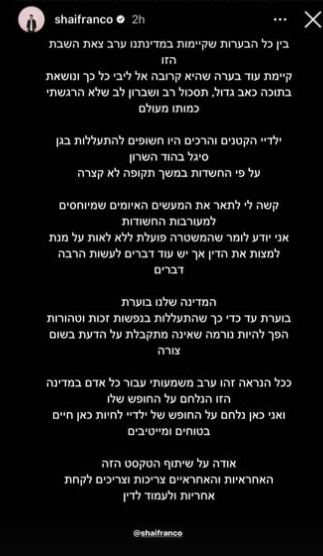 בעיצומן של ההפגנות נגד הרפורמה המשפטית, כשהמדינה בוערת ומפלס העצבים נוסק לגבהים חדשים, שיתף אמש (מוצ"ש) צלם האופנה הידוע, שי פרנקו, פוסט מטלטל וקורע לב על ההתעללות שחוותה בתו בת השנה וחצי בגן מידי הגננת שלה וזעק לשיתוף החשוב של מילותיו הקשות.