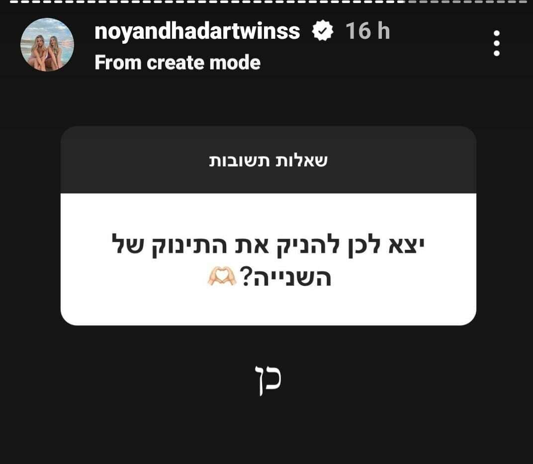 התאומות נוי והדר התארסו באותו היום, התחתנו בהפרש של חודשיים וילדו בהפרש של שבועיים, אבל התגלית שנחשפה בסשן שאלות ותשובות ארוך באינסטגרם שקיימו אמש (ראשון) השתיים עם 362 אלף עוקביהן, הייתה מפתיעה אפילו כשמדובר בתאומות זהות שעושות (כמעט) הכל יחד.