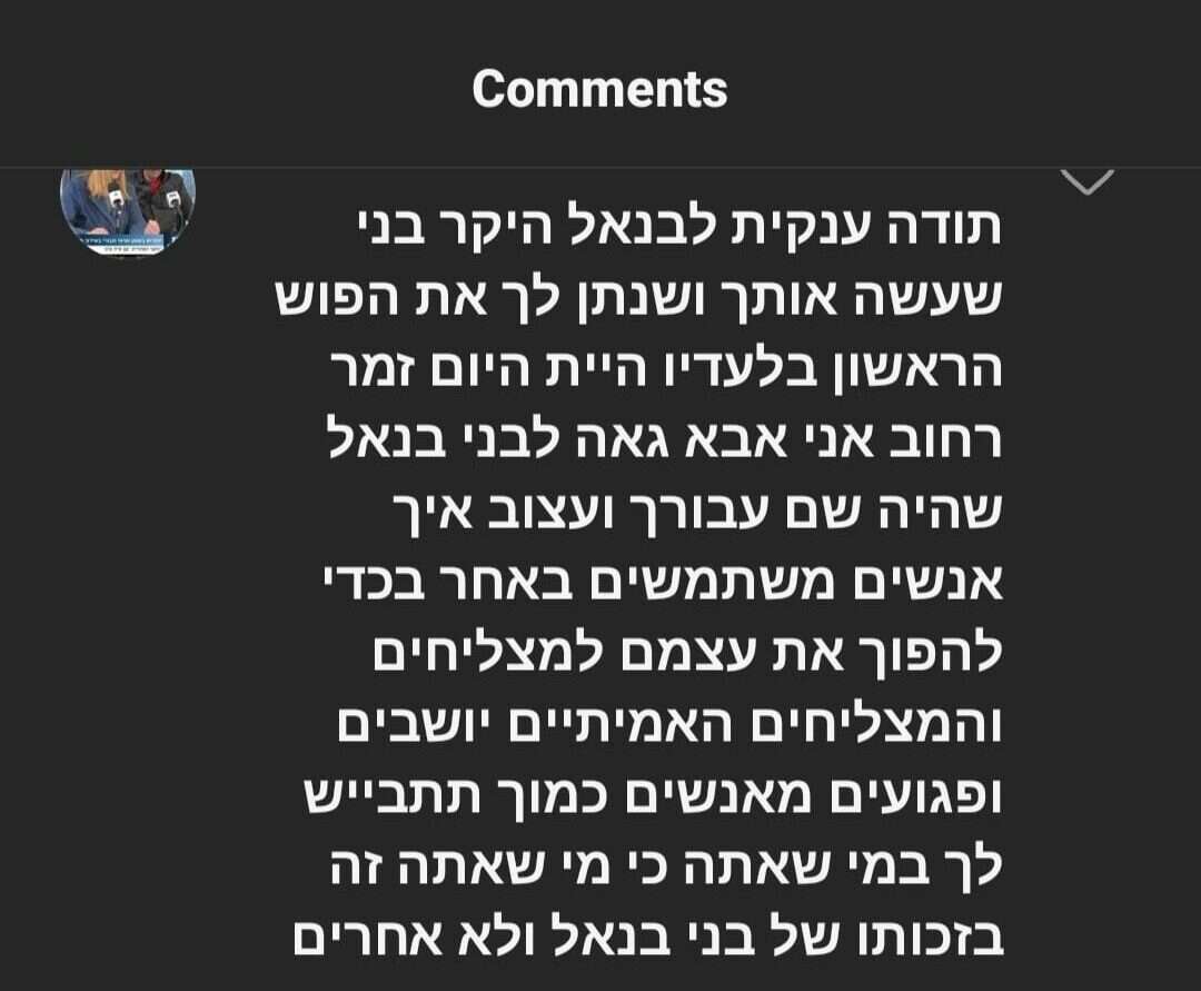 "עצוב איך אנשים משתמשים באחר בכדי להפוך את עצמם למצליחים, והמצליחים האמיתיים יושבים ופגועים מאנשים כמוך", המשיך וכתב. "תתבייש לך במי שאתה, כי מי שאתה זה בזכותו של בני בן-אל ולא אחרים. פגועים מאנשים כמוך. תתבייש לך במי שאתה, כי מי שאתה זה בזכותו של בני בן-אל ולא אחרים, ומה בכך שאתה ממש אבל ממש לא זמר אלא צפצפן", חתם בזעם.
