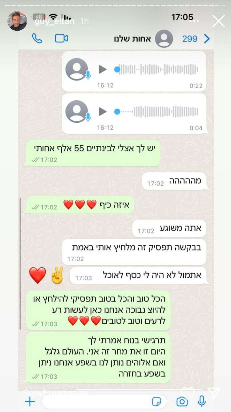 גיא איתן נחשף גם הוא לפוסט הוויראלי שרץ ברשת וכלל צילומי מסך של התכתבות בין שתי אימהות, כשידה של אחת מהן אינה משגת. במהלך השיחה המקוממת בין השתיים נאלצה האם מעוטת היכולת לספוג עלבונות על כך שבתה מגיעה ללא מתנות יקרות ערך למסיבות יום ההולדת שאליהן היא מוזמנת, והתבקשה שלא לשלוח את ילדתה למסיבה הקרובה. במקום לכתוב עוד סטורי מזועזע, איתן החליט היום (שלישי) להיעזר בכוח הרב שיש לו ברשת החברתית אינסטגרם ולעשות מעשה. הוא איתר את האם, פתח עבורה מימון המונים ואסף סכום כסף מכובד.