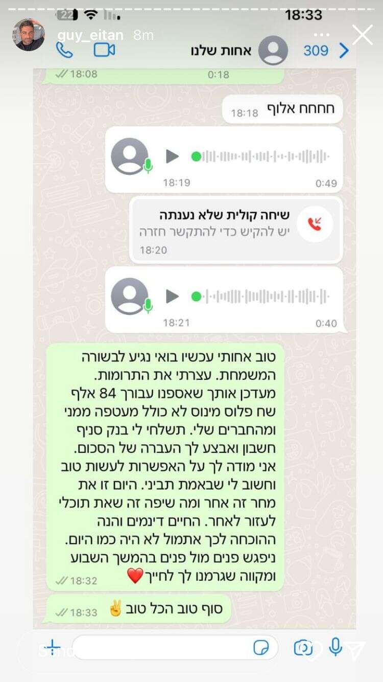 לפני זמן קצר אכן סגר איתן את דף התרומות. "טוב, אחותי, עכשיו בואי נגיע לבשורה המשמחת. עצרתי את התרומות. מעדכן אותך שאספנו עבורך 84 אלף שקלים פלוס מינוס, לא כולל מעטפה ממני ומהחברים שלי. תשלחי לי בנק, סניף חשבון ואבצע העברה של הסכום. אני מודה לך על האפשרות לעשות טוב וחשוב לי שבאמת תביני: היום זו את, מחר זה אחר, ומה שיפה זה שאת תוכלי לעזור לאחר. ניפגש פנים מול פנים בהמשך השבוע, ומקווה שגרמנו לך לחייך".