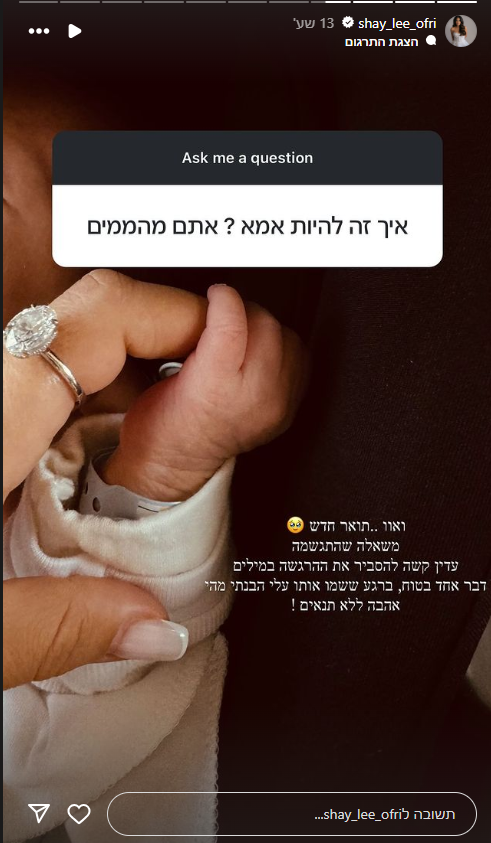 "זו משאלה שהתגשמה", שיתפה עופרי על רקע תמונה שלה ושל כף היד של הרך הנולד. "עדיין קשה להסביר את ההרגשה במילים. דבר אחד בטוח, ברגע ששמו אותו עלי הבנתי מהי אהבה ללא תנאים".