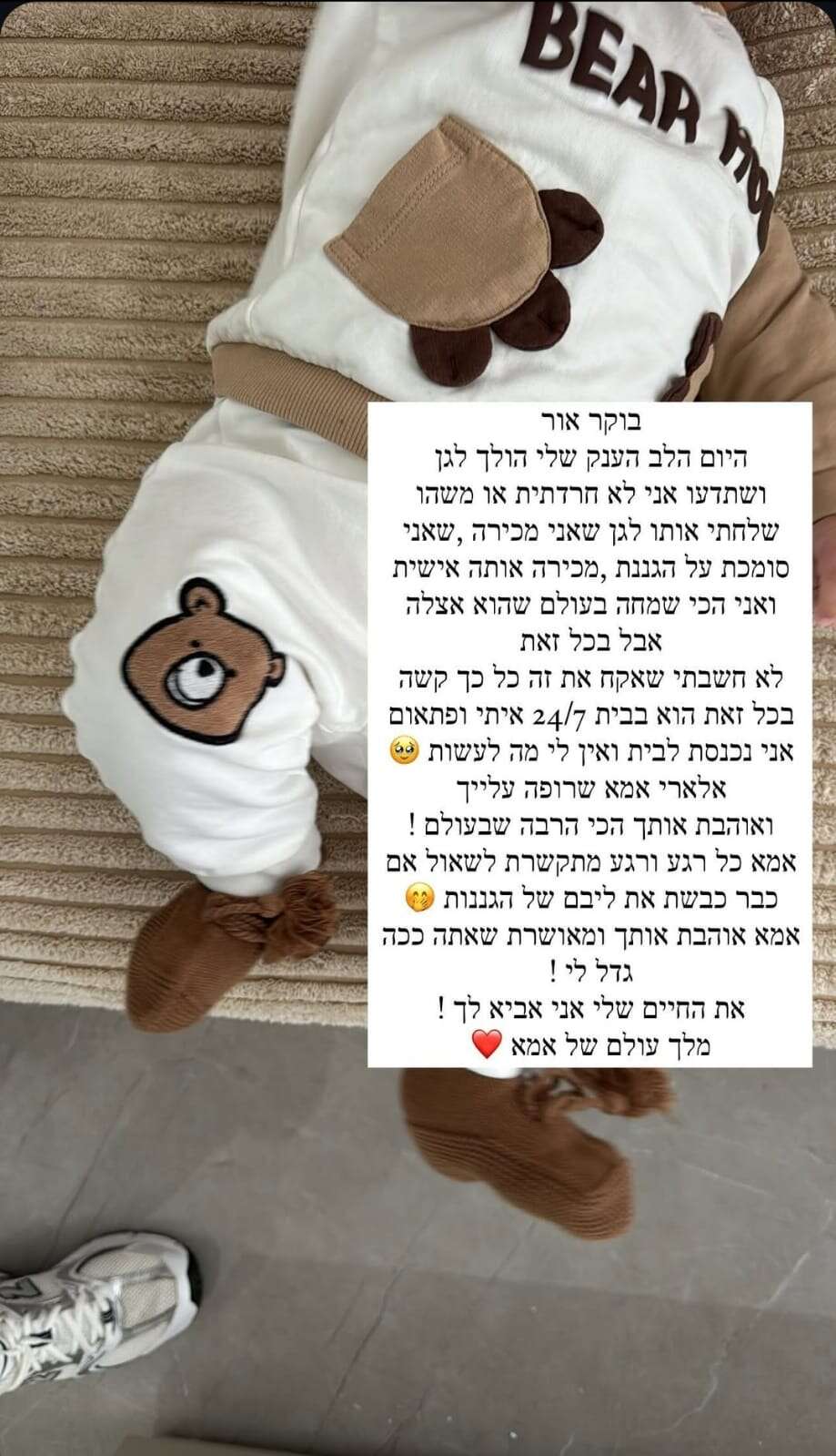 "בכל זאת, הוא בבית 24/7 איתי ופתאום אני נכנסת לבית ואין לי מה לעשות. את החיים שלי אני אביא לך. מלך עולם של אימא".