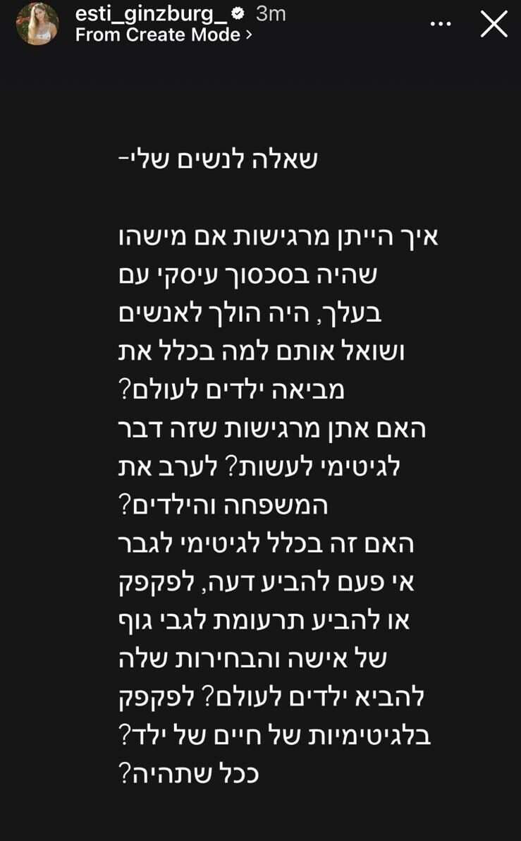 בפנייה לחשבון האינסטגרם שלה, המונה 297 אלף עוקבים, העלתה גינזבורג סטורי תחת הכותרת "שאלה לנשים שלי".