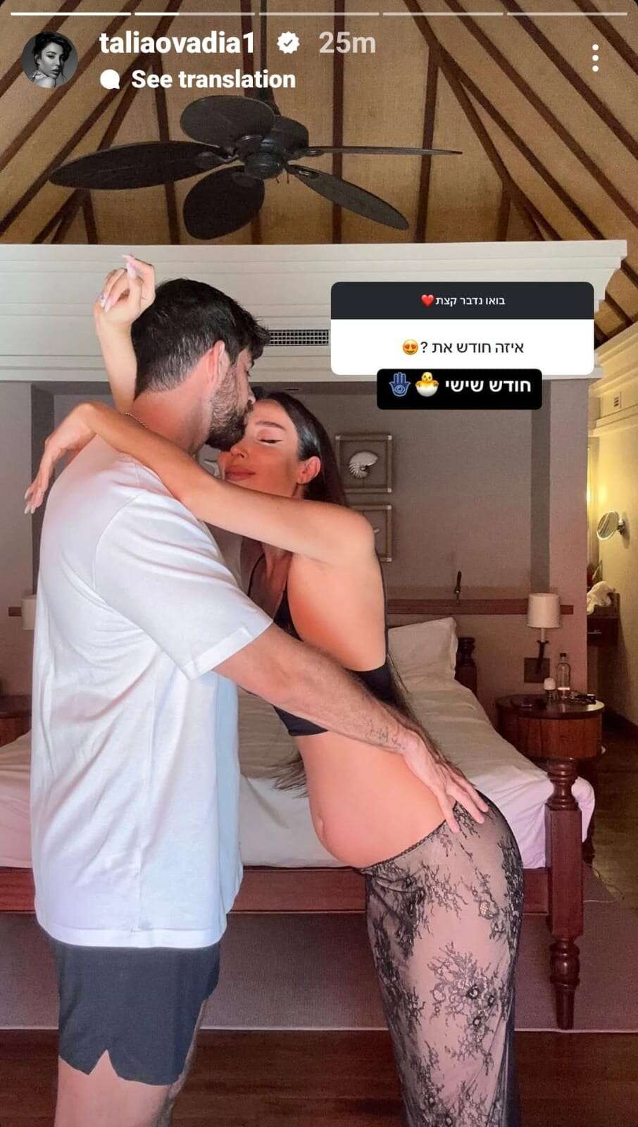 לפני שבוע טליה עובדיה ושחף רז שיתפו בהתרגשות כי אחרי לא מעט מהמורות הם מצפים לצאצא ראשון, אך מסתבר שאת דבר ההיריון הצליחו להסתיר היטב כשטליה חשפה בסוף השבוע שהיא כבר בשליש השלישי בחודש השישי.