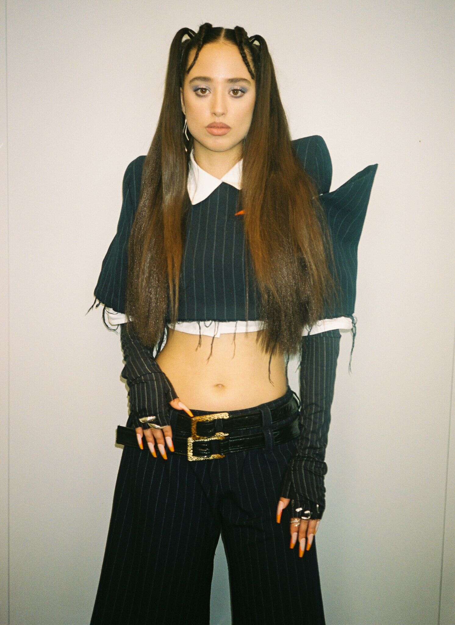 אצל נונו (הזמרת נעמי אהרוני גל) אנחנו זוכים לראות טוטאל לוק רגוע ביחס לבחירות הרגילות שלה, ועדיין הוא הצליח לתפוס אותנו. הזמרת לובשת טופ חושף בטן, שמורכב משני חלקים – צווארון לבן מחויט שמבצבץ גם בחלק התחתון, ומעליו טופ מבד מחויט כהה עם פסי סיכה דקיקים שמגיע עד המרפק, כתפיים מודגשות עם צללית זוויתית, וכפפות ארוכות מאותו הבד בלי קצה האצבעות. היא הוסיפה מכנסיים גצרים עם שתי חגורות שחורות ואבזמים זהובים, שמתחתיהן מגפיים מאותו הבד, עם כיוון אחר לפסים, שמגיעים מעל הברך, ומשלימים את הלוק. פנינו לסטייליסט האישי שלה, עומר יהב, לפרטים נוספים.