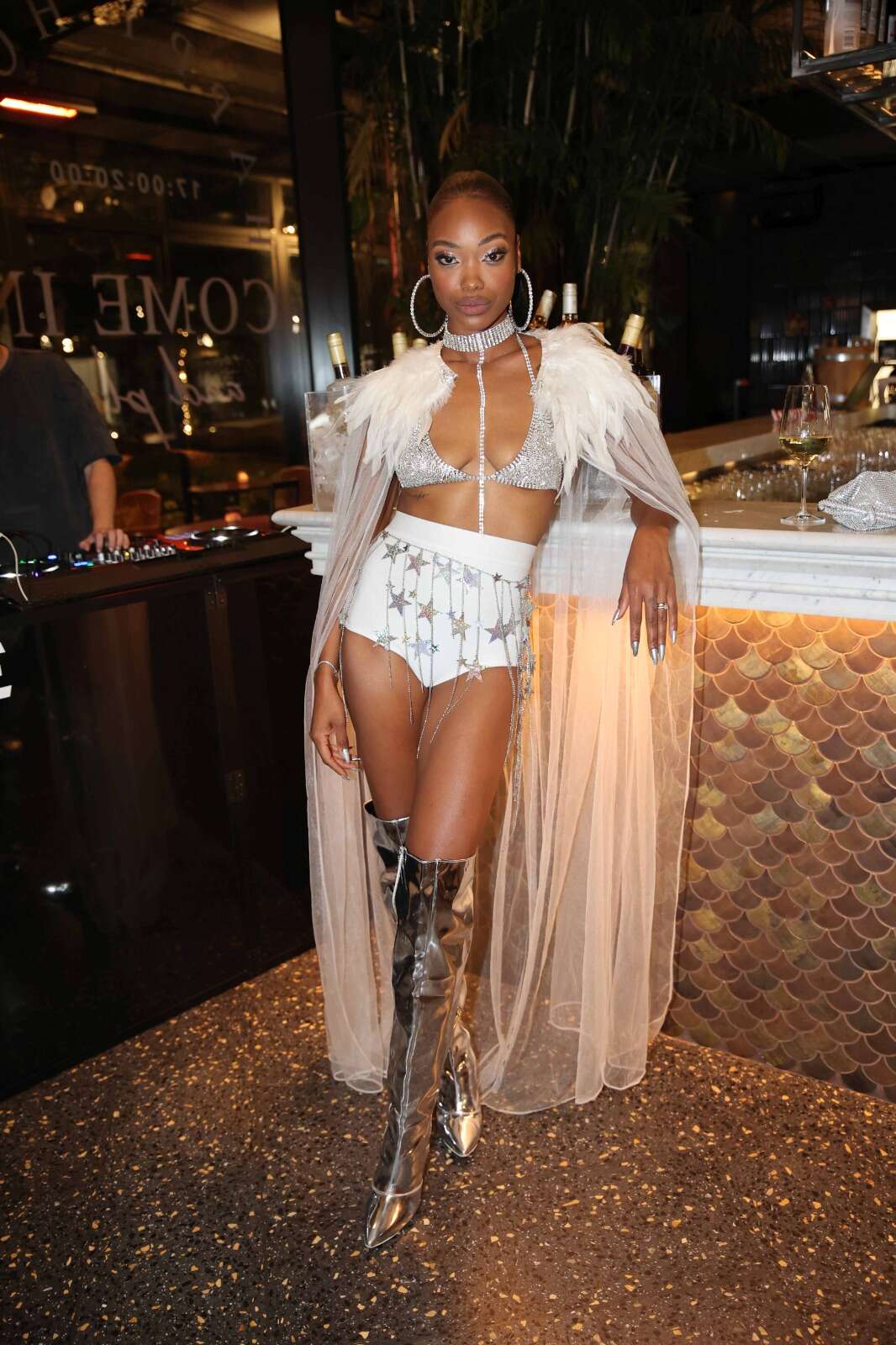 מי שעוד הגיעה להרים היא הדוגמנית יושיבה ג'ונס, שהגיעה בטוטאל לוק שהפיל לנו את הלסת. היא לבשה מכנסונים גבוהים בגזרת תחתונים שעוטרו בכוכבים, בשילוב טופ משולשים מנצנץ, שרשרת צ'וקר, עגילי חישוק ענקיים, גלימה שקופה ומגפיים כסופים שעוברים את הברכיים.