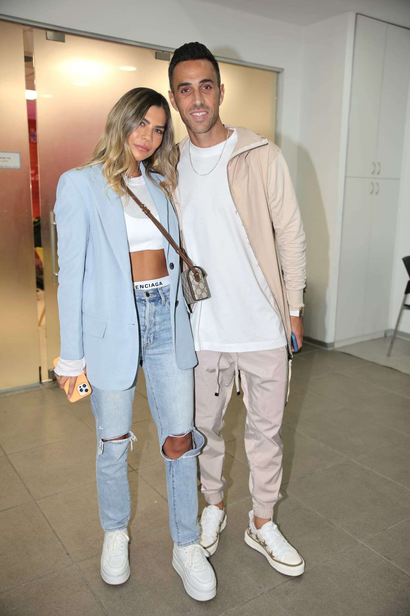 הכדורגלן ערן זהבי ואשתו שי, הגיעו בצבעוניות רגועה ומוצלחת במיוחד, שעובדת נהדר ביחד ובנפרד. ערן לבש מכנסי בד בצבע אבן בגזרה ספורטיבית, בשילוב עם טישירט לבנה בגזרת אוברסייז, סווטשירט קפוצ'ון מעוצב בצבע בז', וסניקרס לבנות עם כוכבים מודפסים. שי לבשה מכנסי ג'ינס סקיני בצבע תכלת עם קרעים באזור הברכיים, בשילוב טופ לבן חושף בטן, ז'קט מחויט תכלת, סניקרס לבנות ותיק צד ממותג בצבעוניות של בז' וחום. השילוב בין הגוונים החומים והבז' לתכלת עובד מדהים, ואנחנו אהבנו את שני הלוקים.