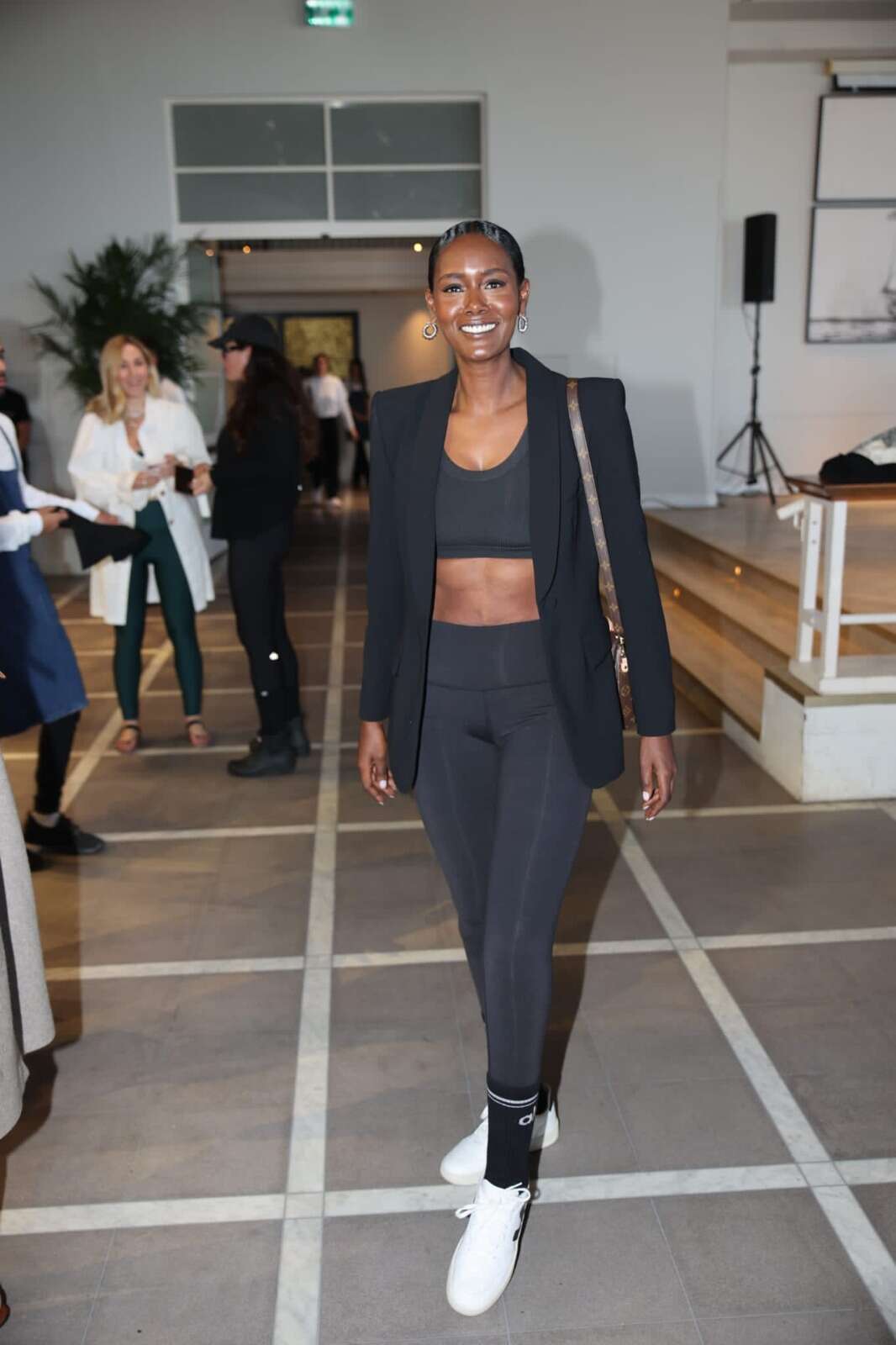 הדוגמנית טהוניה רובל הגיעה בלוק מעט מבלבל. מצד אחד פריטי ספורט, ומצד שני ז'קט סופר אלגנטי ותיק ממותג. היא לבשה סט שחור שכולל טייץ וגוזייה, בשילוב גרביים שחורות מוגבהות וסניקרס לבנות. עד כאן הכל עובד נכון, ואז היא שילבה את פריטי הספורט עם ז'קט שחור אלגנטי, ותיק חום עם הדפס של לואי ויטון. גם הצבעוניות לא מדויקת, וגם הפריטים לא מתחברים.