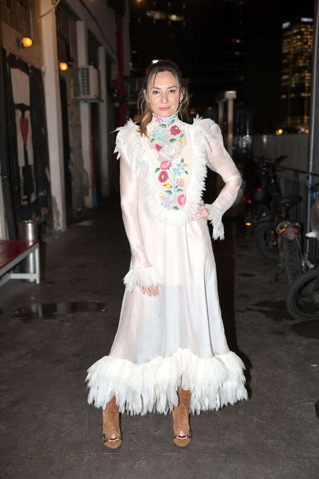 מיכל אנסקי הגיעה בשמלה הכי מרשימה, וגם שברה את קוד הלבוש השחור ולבן שבו הגיעו כולן. היא לבשה שמלה לבנה מעוטרת בנוצות, עם צווארון מוגבה ורקמה של פרחים בחלקה הקדמי. היא שילבה אותה עם מגפי זמש בצבע קאמל, שלדעתנו מכבידים על הלוק. היינו בוחרים בנעלי עקב קלאסיות פתוחות באחד מצבעי הרקמה, ליצירת סיפור הרמוני.