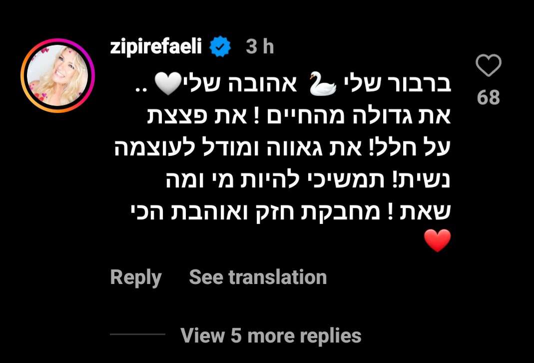 בין מאות התגובות המחנכות, היו גם מי שביקשו לפרגן ולהחמיא לרפאלי, בראשן אמה ציפי: "ברבור שלי, אהובה שלי, את גדולה מהחיים", כתבה. "את פצצת על חלל. את גאווה ומודל לעוצמה נשית. תמשיכי להיות מי ומה שאת, מחבקת חזק ואוהבת הכי", חתמה באהבה.