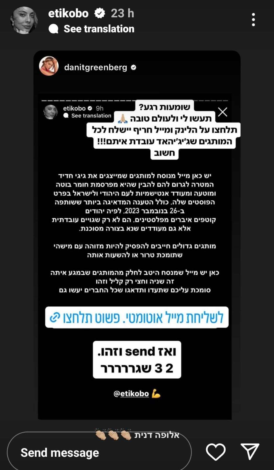 "מותגים גדולים חייבים להפסיק להיות מזוהים עם מישהי שתומכת טרור או להשעות אותה", דרשה והוסיפה קישור קליקבילי לטמפלט מוכן מראש של המייל המדובר אותו ביקשה ממאות אלפי עוקביה לשתף ולשלוח. "כאן יש מייל שמנוסח היטב לחלק מהמותגים שבמגע איתה. זה שנייה וחצי רק קליק וזהו. סומכת עליכם שתעשו ותדאגו שכל החברים יעשו גם".