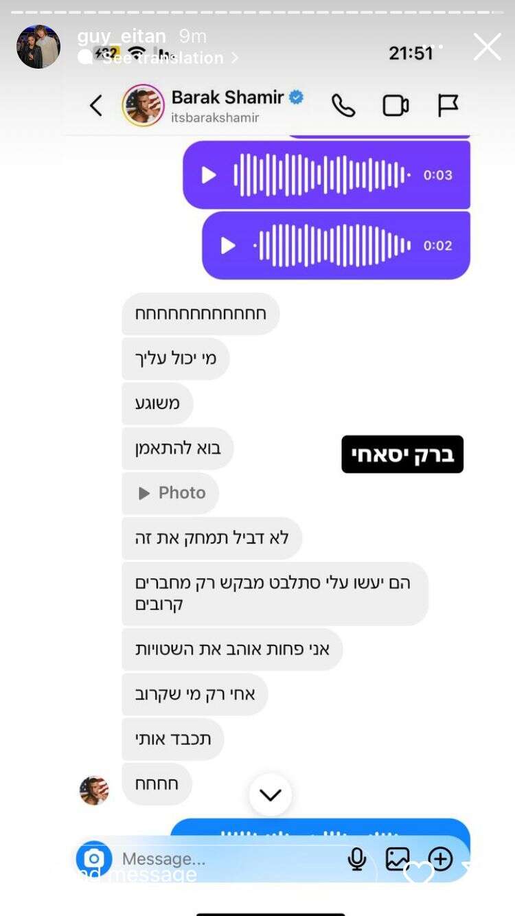 בהמשך, איתן כמו איתן, לא רק שלא מחק את צילומי המסך, הוא אף הוסיף קטע נוסף ששמיר מפציר בו להסיר את התוכן. "לא, דביל. תמחק את זה", גער בו הדוגמן בהתכתבות בין השניים באינסטגרם. "הם יעשו עליי סתלבט, מבקש רק מחברים קרובים. אני פחות אוהב את השטויות. אחי, רק מי שקרוב. תכבד אותי", ביקש לשווא.