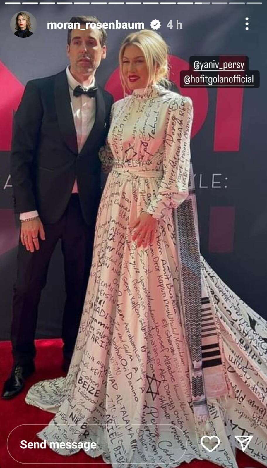 את השמלה יצר המעצב הישראלי יניב פרסי, שצעד בגאווה לצידה של גולן על השטיח האדום בכניסה למסיבה, כשהשניים מייצרים עניין רב בקרב הצלמים שביקשו לתעד את הבחירה האופנתית עם המסר הפוליטי הברור.