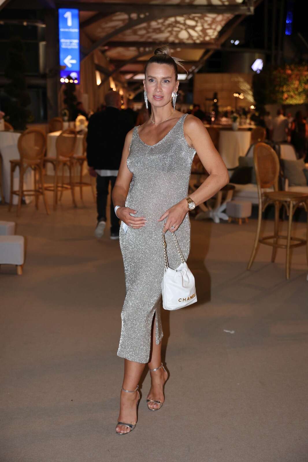 והנה לוק שאהבנו במיוחד: שונית חמד בטוטאל לוק קלאסי אלגנטי ומחמיא. היא לבשה שמלה כסופה מנצנצת צמודה באורך שבע שמיניות, בשילוב סנדלי עקב כסופים עדינים, עגילי שנדליר דומיננטיים – ורק התיק הלבן עם השרשרת הזהובה פחות התחבר לסיפור, אז נבחר באומץ להתעלם ממנו.