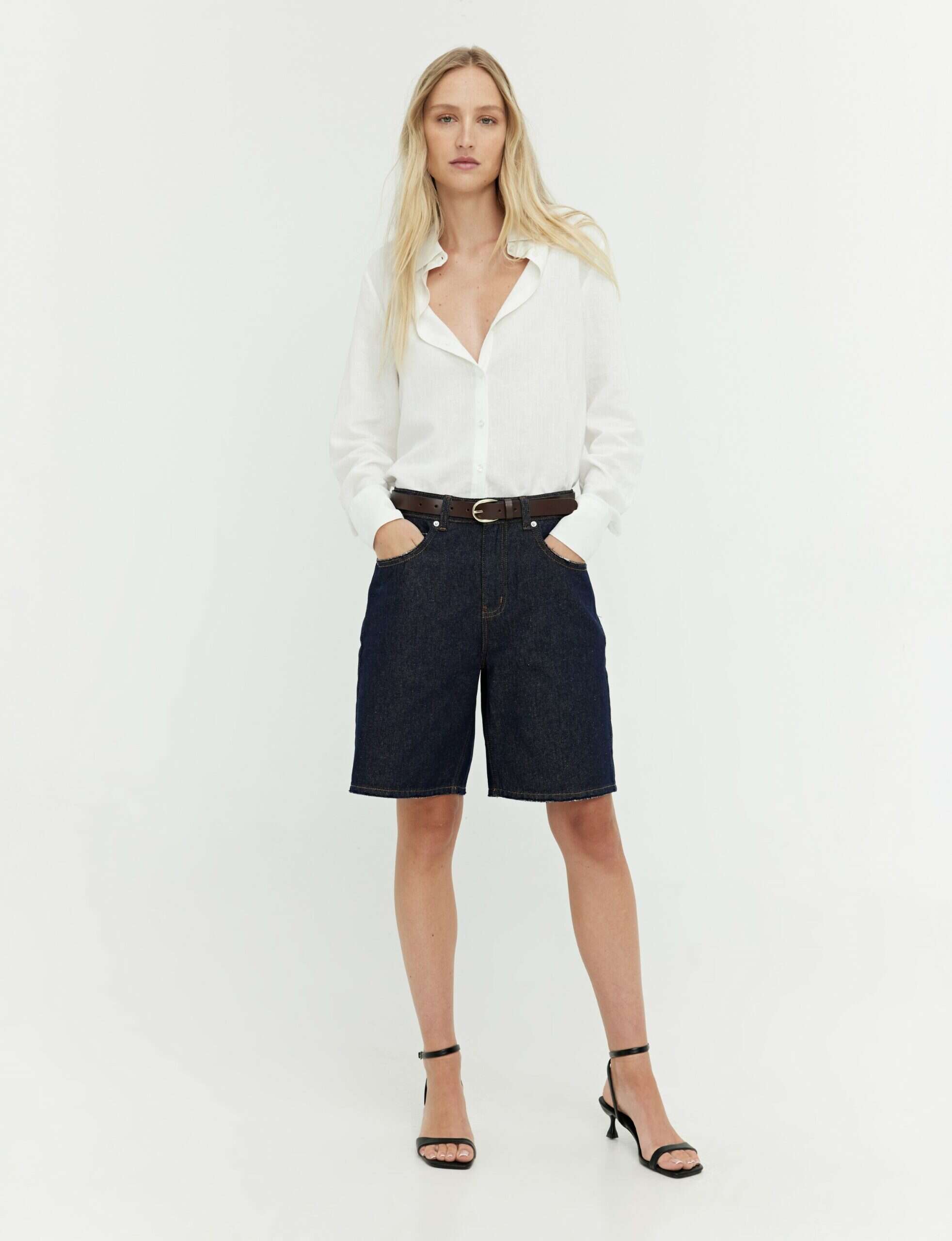 מכנסי ברמודה יכולים להתאים בהחלט גם למקום עבודה רשמי, אך בתנאי שהם מעוצבים כראוי. זוג מכנסי ברמודה בגזרה גבוהה בצבע קלאסי כמו נייבי או אפור פחם, מחובר לחולצה מכופתרת לבנה קלאסית או וסט מחויט, יוצר מראה מהוקצע.