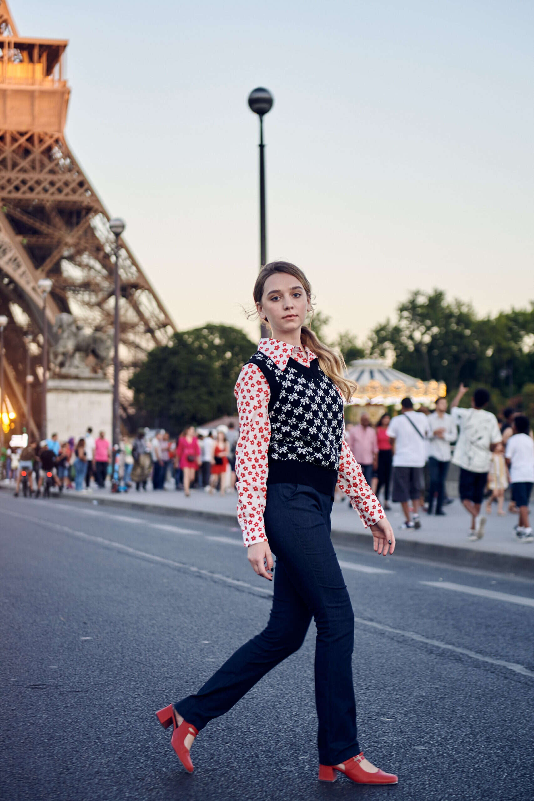 עלמה בצלאל, בתה של נעמה, בהפקה בפריז. שילוב של פרינטים ביחד / צילום: דן ספיגלמן
